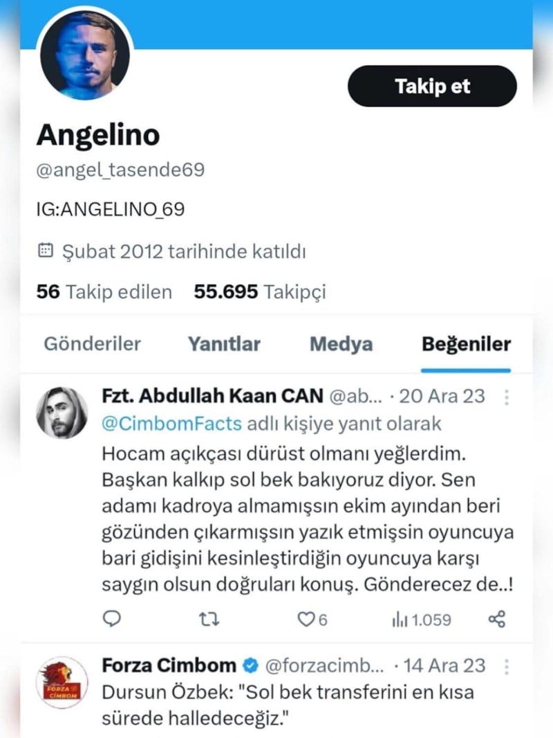 Okan Buruk'un geçtiğimiz günlerde yaptığı açıklamanın altına gelen bir yorumu beğenen Angelino, Dursun Özbek'in de sol bek aradığına dair bir haberi beğenerek taraftarın tepkisini çekti.