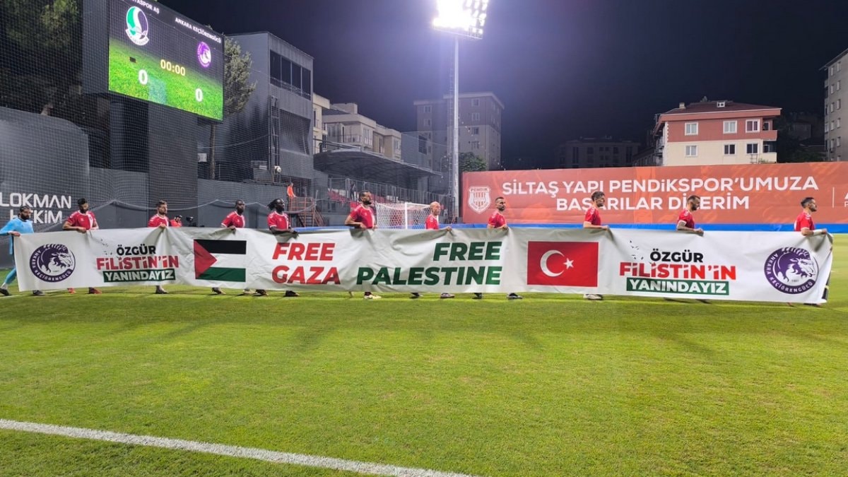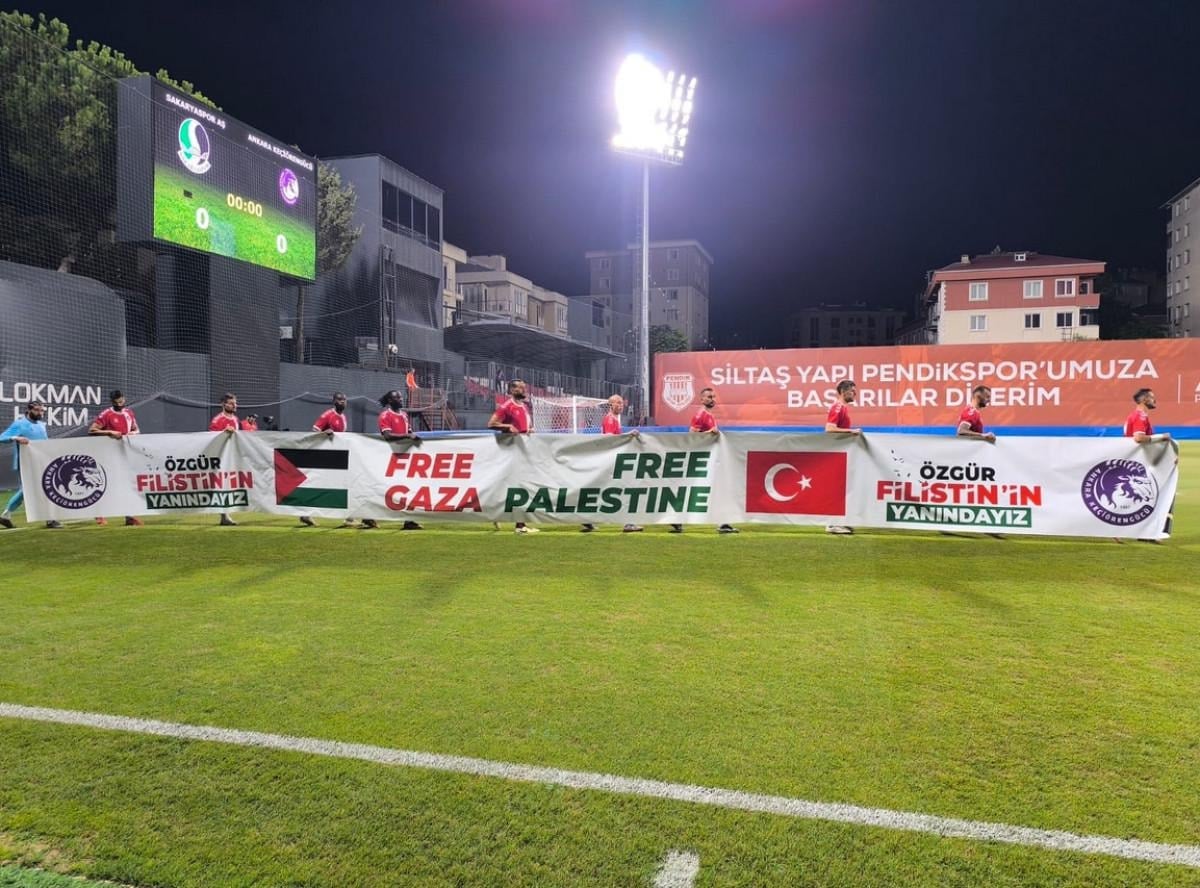 Futbolcular, sahaya "Özgür Filistin'in Yanındayız" yazılı pankartla çıkarak Filistin'e olan desteklerini dile getirdiler.