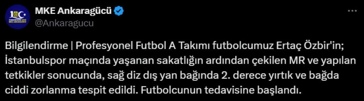 Ankaragücü, Süper Lig'de İstanbulspor ile oynanan maçta sakatlanan kaleci Ertaç Özbir'in sağ diz yan bağında yırtık ve ciddi zorlanma tespit edildiğini açıkladı.