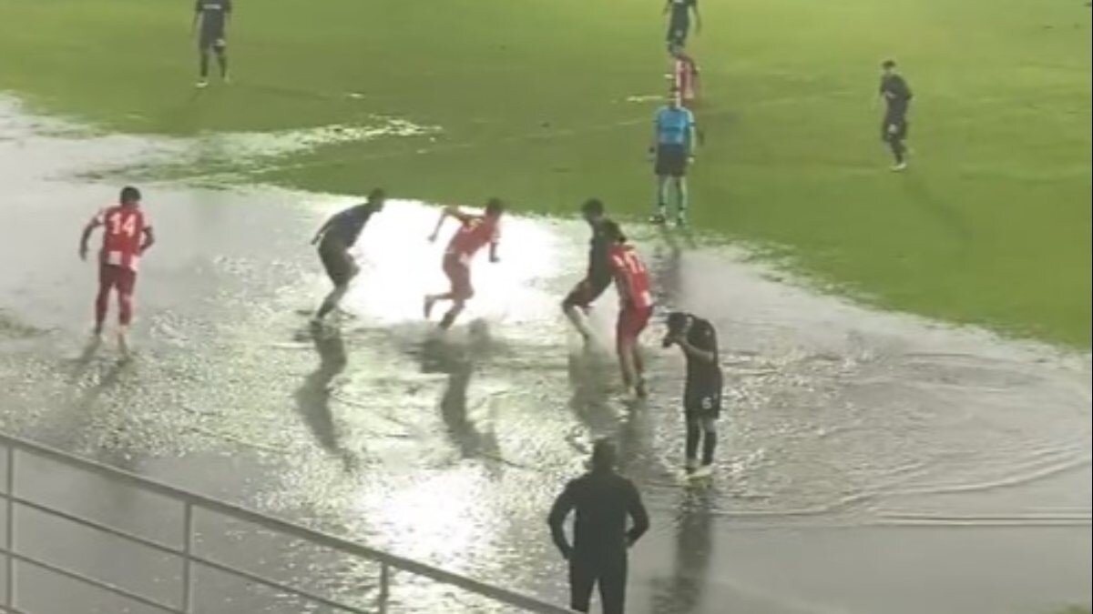 Maçta farklı skorun yanı sıra dikkat çeken başka bir olay yaşandı. Yoğun yağış nedeniyle zemin adeta göle döndü.