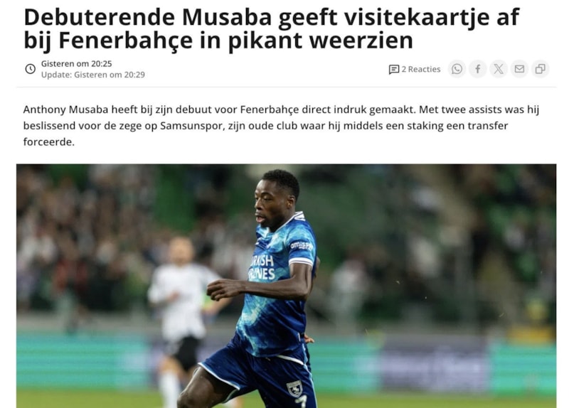 Hollanda'nın önde gelen futbol platformlarından Vi.nl, Musaba'nın ilk maçındaki etkisini vurguladı. Haberde, "Yeni transfer Anthony Musaba, Fenerbahçe'de heyecan dolu ilk maçında unutulmaz bir izlenim bıraktı." ifadeleri kullanıldı.