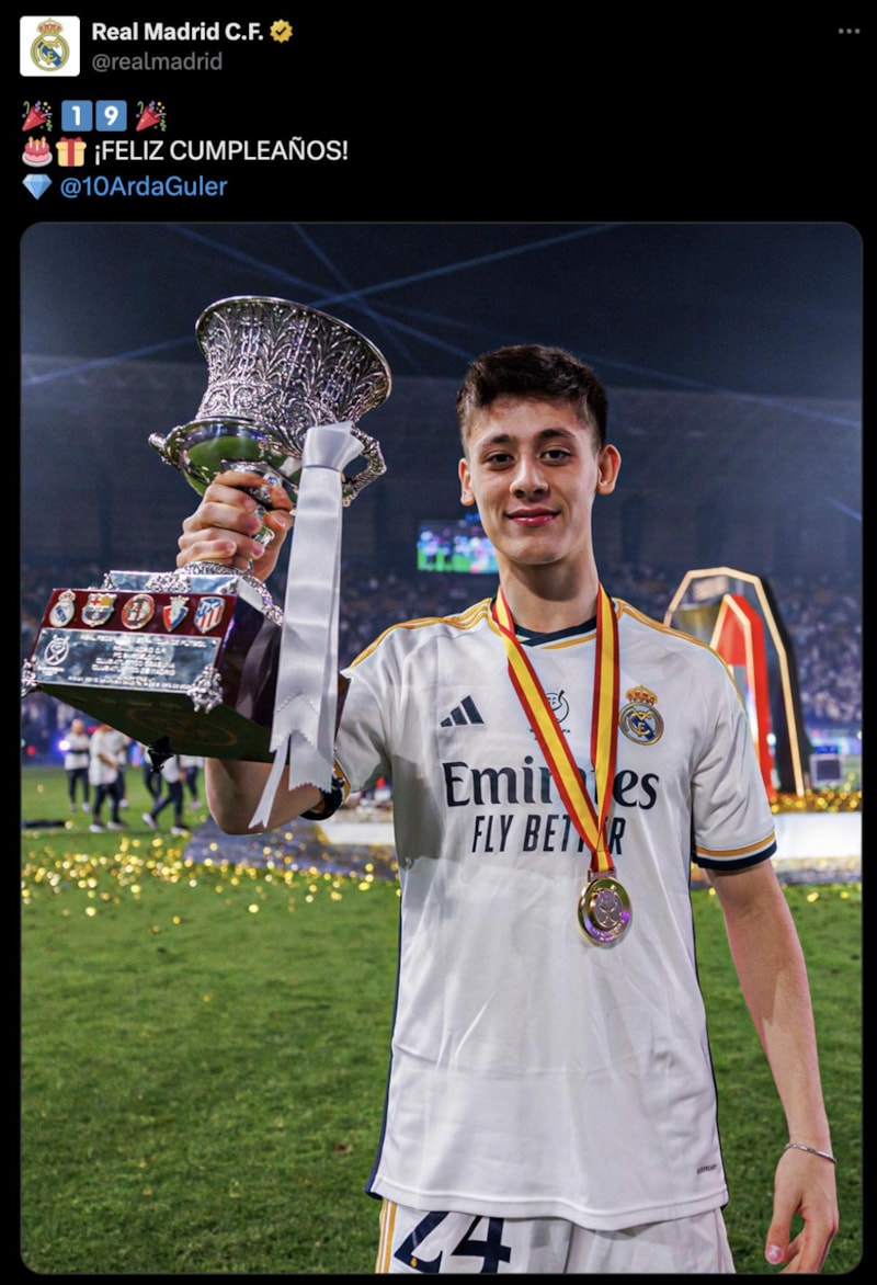 Yetenekli futbolcunun kulübü Real Madrid, sosyal medyadan doğum günü paylaşımı yaptı. İspanyol ekibi, Arda'nın yeni yaşını kutladı.