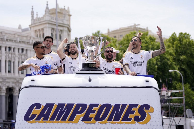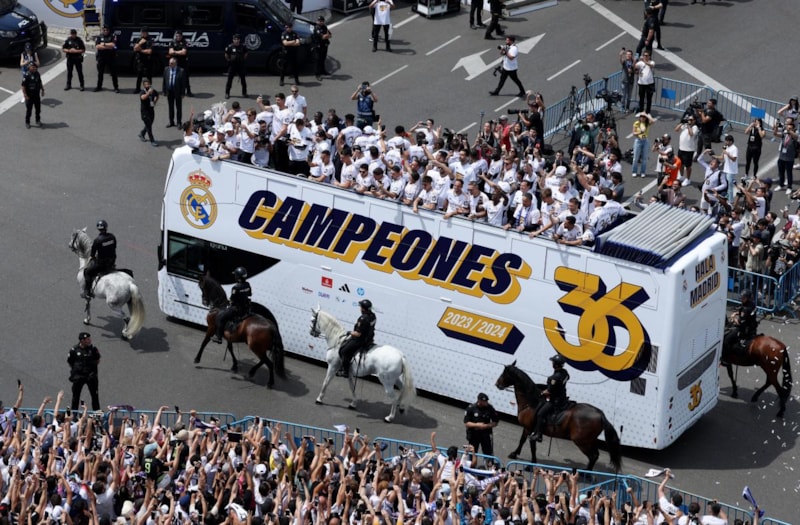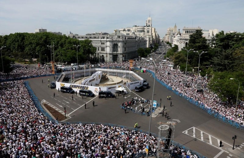Bu sezon İspanya Süper Kupası'ndan sonra lig şampiyonluğunu da kazanan Real Madrid'in kent merkezindeki kutlamalarını binlerce taraftarı izledi.