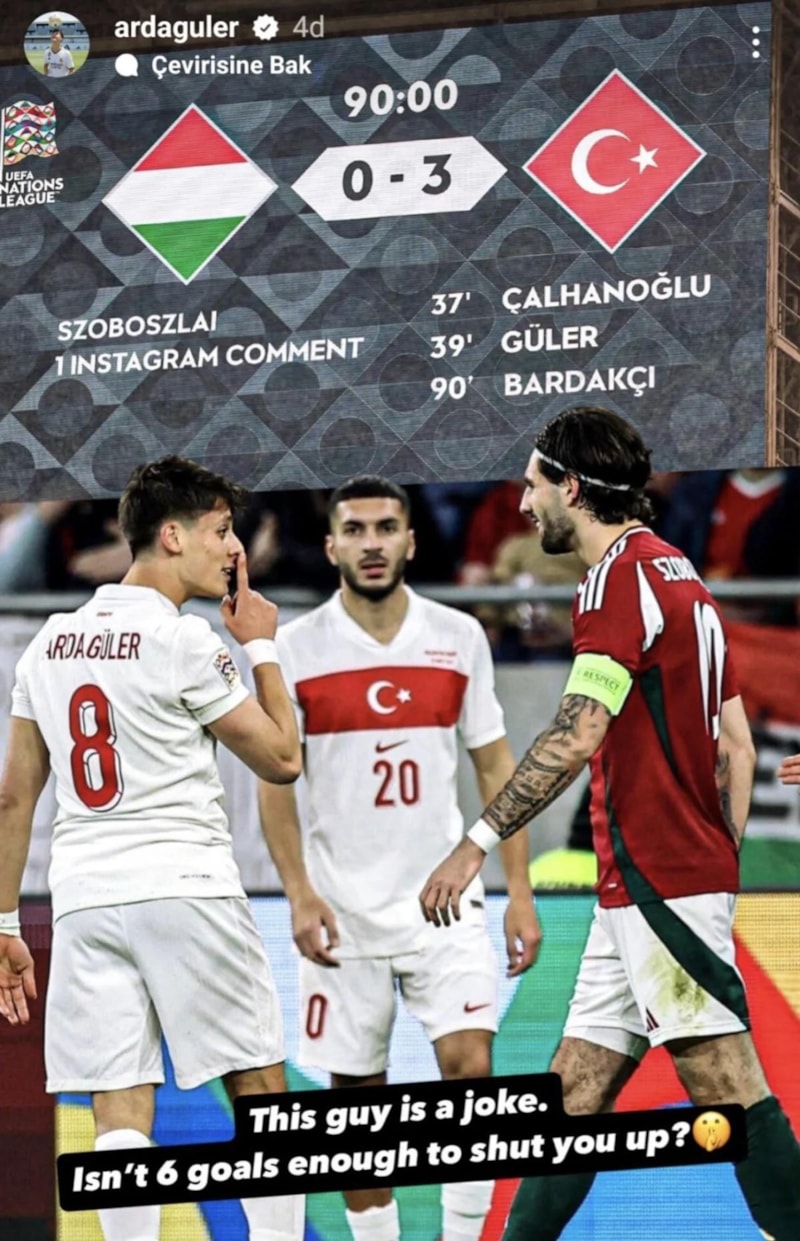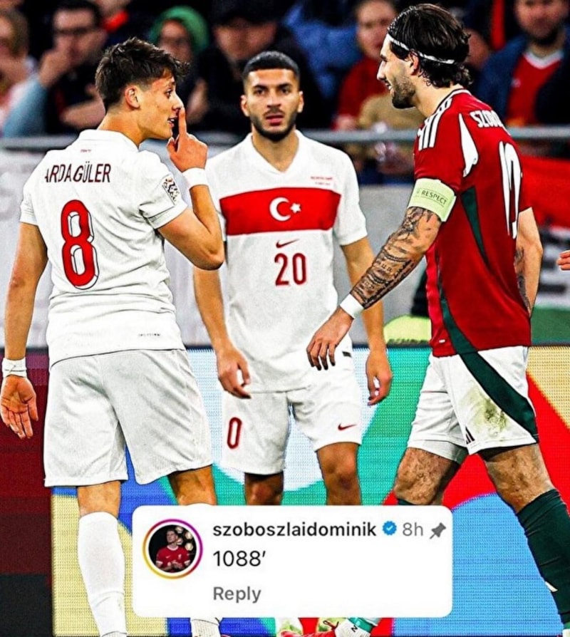 Maçın ardından Szoboszlai, yaşanan gerginliği sosyal medyada devam ettirdi. Bir Macar haber sitesinin, Arda’nın ‘sus’ işareti yaptığı anın fotoğrafını paylaşmasının ardından 24 yaşındaki futbolcu, bu gönderiye “1088” yorumunu bıraktı. Bu rakam, Arda Güler’in bu sezon Real Madrid formasıyla sahada geçirdiği toplam dakikaya gönderme yapıyordu. Szoboszlai’nin bu hamlesi, genç futbolcumuza alaycı bir mesaj olarak yorumlandı.