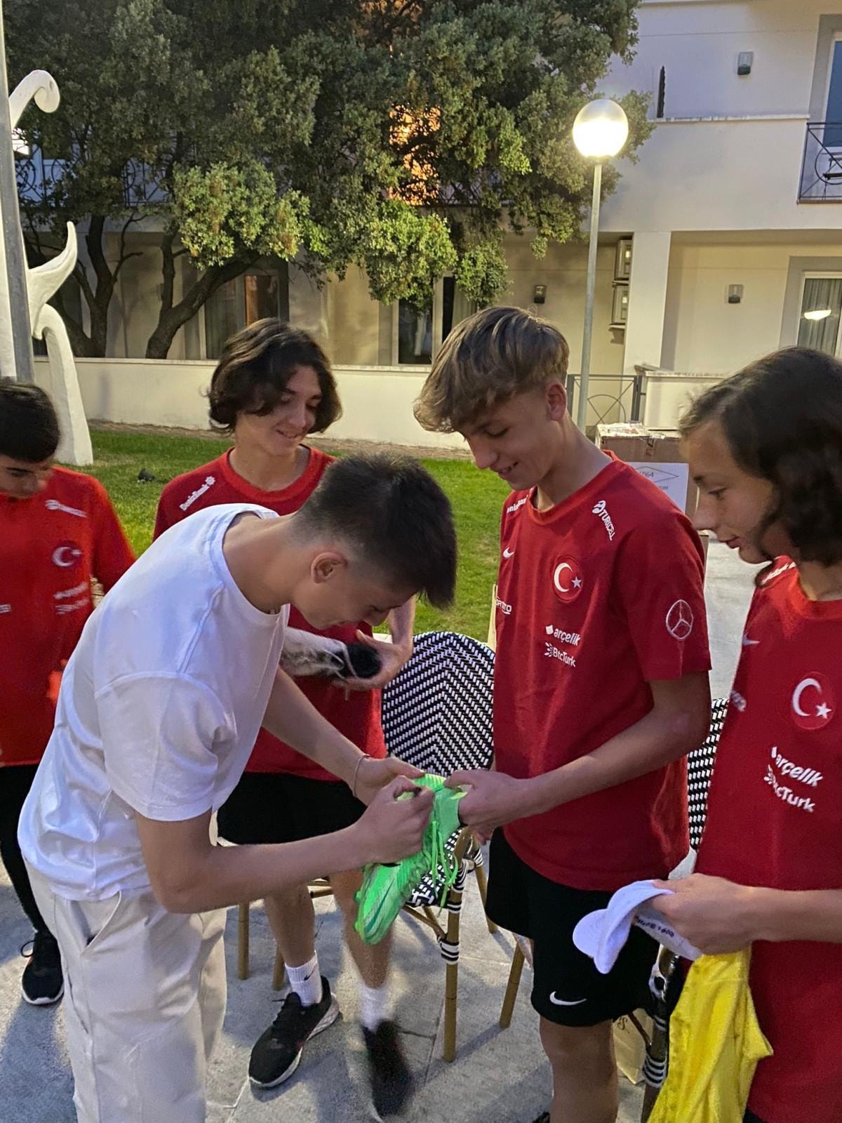 U14 Milli Takım oyuncularına birer krampon hediye eden Arda, daha sonra imza dağıttı ve günün anısına takımla grup fotoğrafı çektirdi.