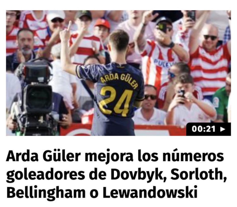Milli futbolcu Arda Güler, Granada karşısında Real Madrid formasıyla 3. golünü atarken, maçın ardından İspanyol basınından övgüler aldı.