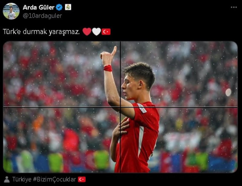 Maçın ardından Arda Güler, kişisel sosyal medya hesabında maçtan fotoğraflar paylaşarak, "Türk'e durmak yaraşmaz" notunu düştü.