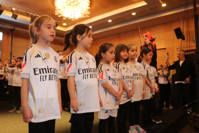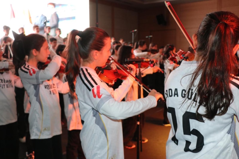 Gecede sahne alan BAİBÜ Çocuk Korosu ile Milli Eğitim Müdürlüğü Arkadaşım Keman Orkestrası öğrencileri, üzerlerindeki Arda Güler formalarıyla unutulmaz bir gösteriye imza attı.