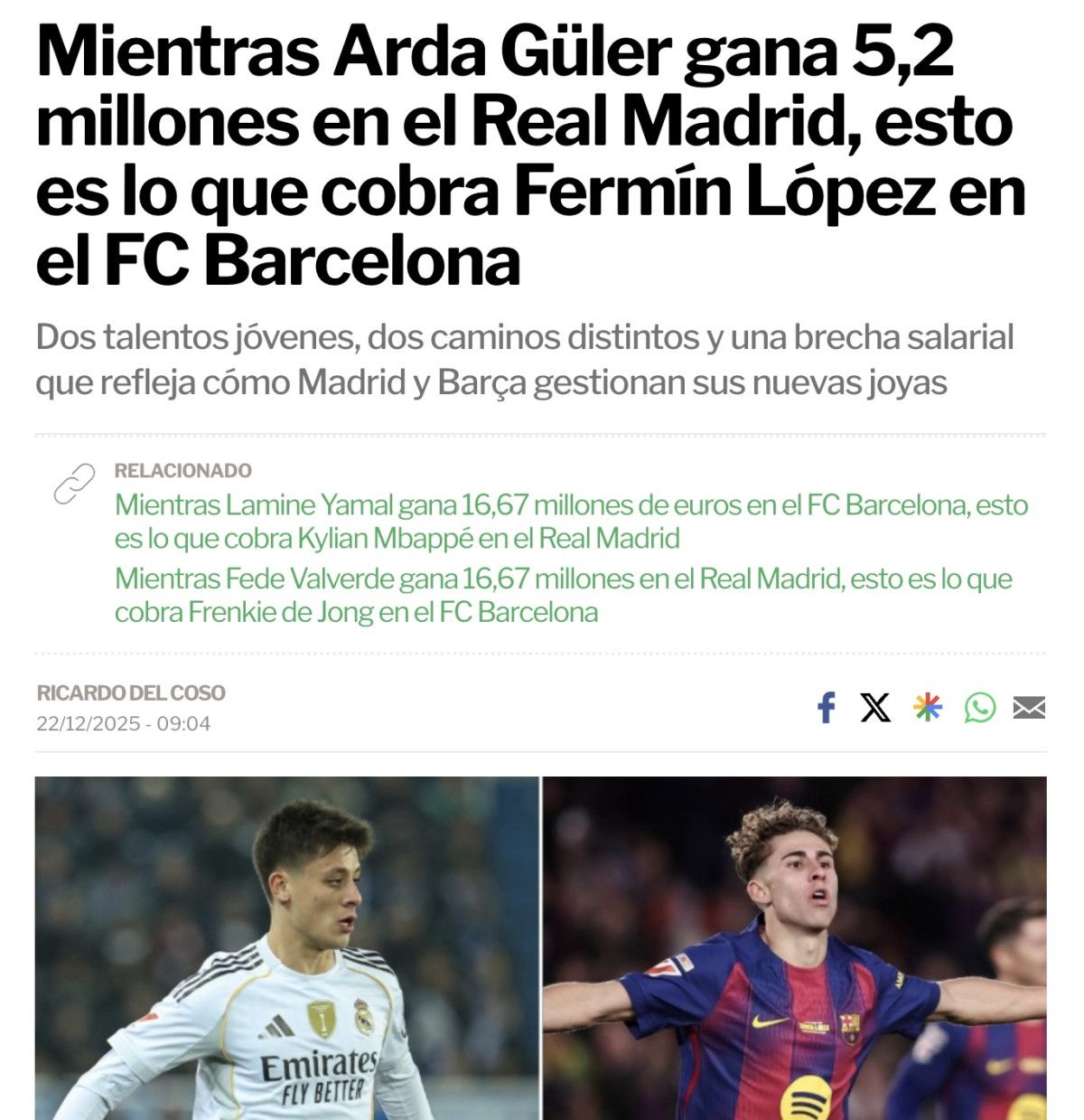 Xabi Alonso döneminin ardından Real Madrid'de önemli bir rol üstlenen ve başarılı bir sezon geçiren Arda Güler, bu kez performansıyla değil, kazancıyla Barcelona'nın genç yıldızı Fermin Lopez ile karşılaştırıldı.