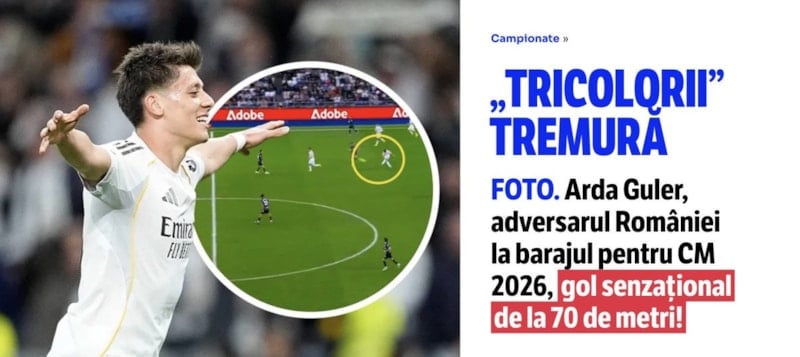 Real Madrid'in Elche ile oynadığı maçta Arda Güler'in kaydettiği müthiş gol, Dünya Kupası play-off yarı finalinde karşılaşacağımız Romanya'da gündem oldu. Arda'nın müthiş golüyle ilgili atılan manşette, 'Romanya Milli Takımı titriyor' ifadeleri kullanıldı.
