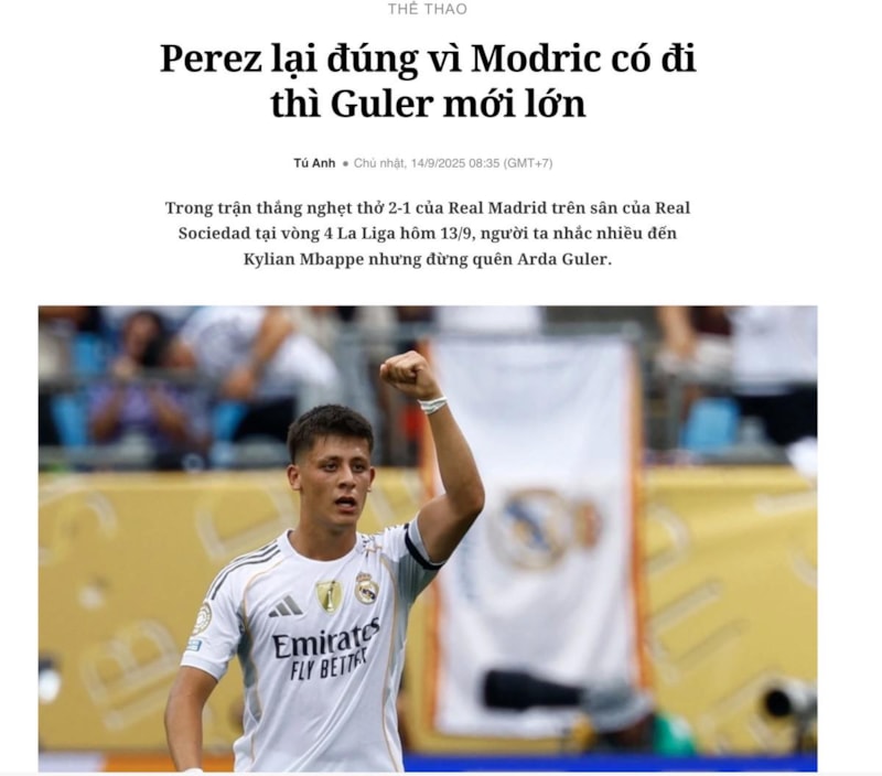 İspanya La Liga'nın 4. hafta maçında Real Madrid, deplasmanda Real Sociedad'ı 2-1 mağlup etti. Müsabakada milli yıldız Arda Güler golünü attı ve dikkatleri üzerine çekmeye devam etti. Genç futbolcunun bu performansı dış basında geniş yer buldu.