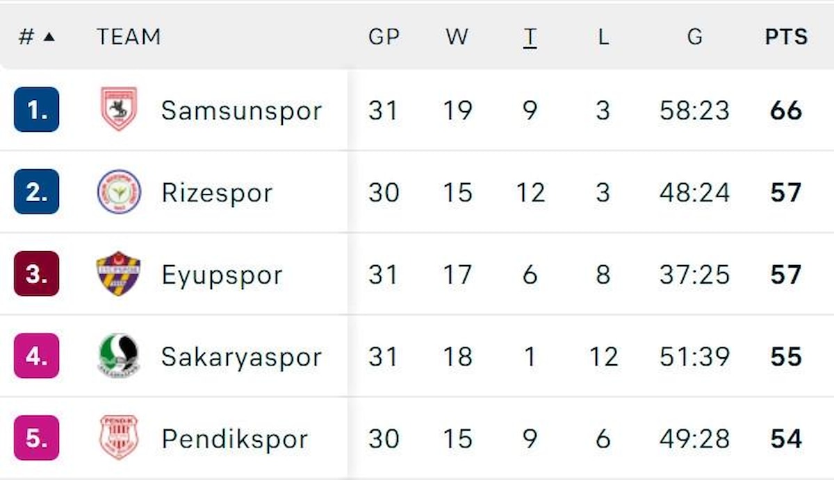Eyüpspor, 26 hafta zirvede kalmayı başarsa da son haftalarda düşüşe engel olamamıştı. Süper Lig'e çıkma mücadelesini sürdüren İstanbul ekibi, ligde 17 galibiyet, 6 beraberlik ve 8 mağlubiyet aldı ve 3. sırada bulunuyor.