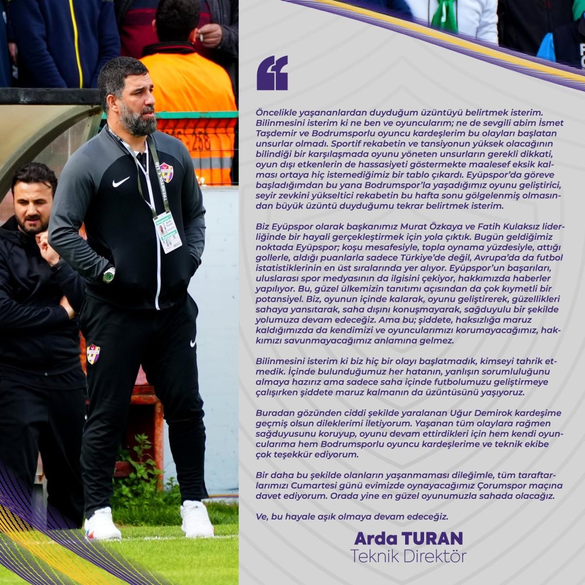 Yaşanan bu gerginlik sonrasında ise Eyüpspor Teknik Direktörü Arda Turan, kulübün sosyal medya hesabına açıklamalar yaptı.