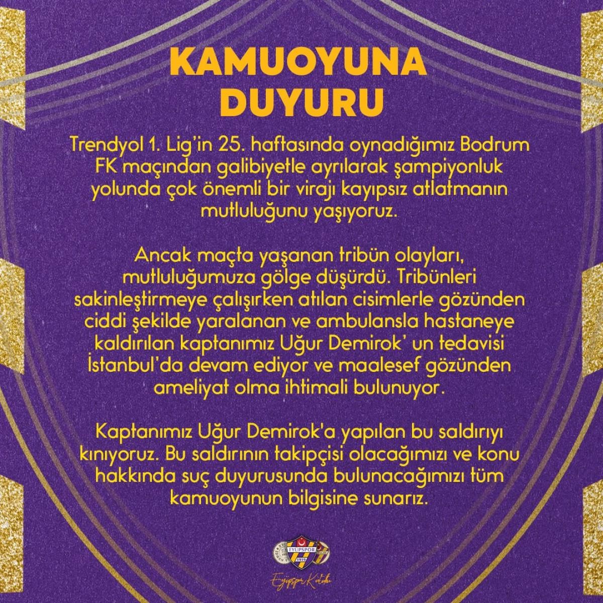 1. Lig’in 25. haftasında oynadığımız Bodrum FK maçından galibiyetle ayrılarak şampiyonluk yolunda çok önemli bir virajı kayıpsız atlatmanın mutluluğunu yaşıyoruz. Ancak maçta yaşanan tribün olayları, mutluluğumuza gölge düşürdü. Tribünleri sakinleştirmeye çalışırken atılan cisimlerle gözünden ciddi şekilde yaralanan ve ambulansla hastaneye kaldırılan kaptanımız Uğur Demirok’un tedavisi İstanbul’da devam ediyor ve maalesef gözünden ameliyat olma ihtimali bulunuyor. Kaptanımız Uğur Demirok'a yapılan bu saldırıyı kınıyoruz. Bu saldırının takipçisi olacağımızı ve konu hakkında suç duyurusunda bulunacağımızı tüm kamuoyunun bilgisine sunarız.