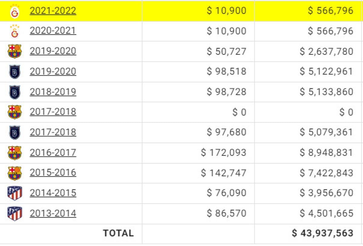 Capology adlı istatistik sitesinden alınan bilgiye göre; Turan'ın 2013'ten beri futbolculuktan kazandığı para şu şekilde: