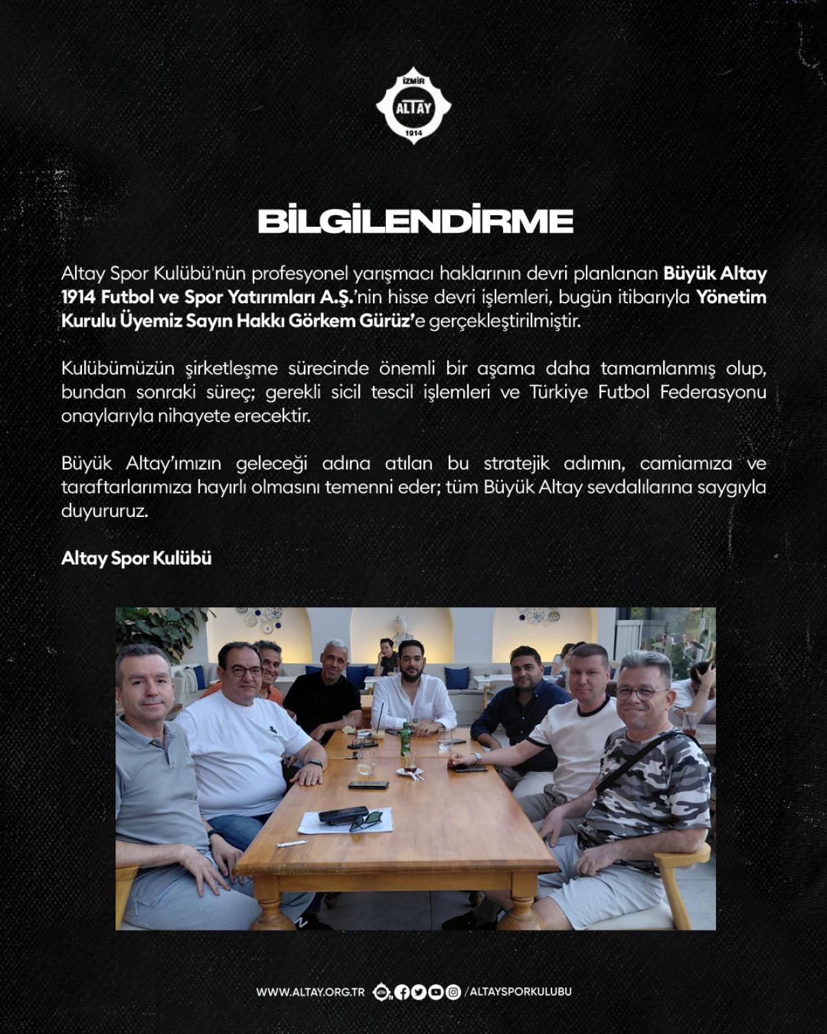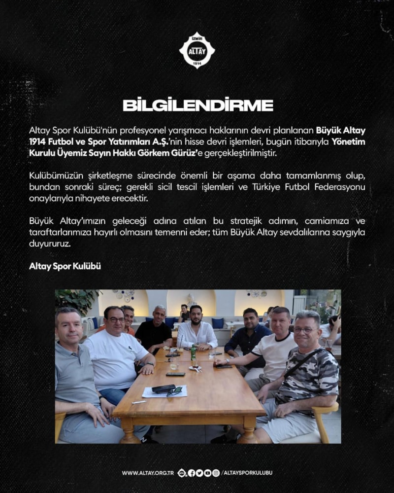 Altay Spor Kulübü'nün profesyonel yarışmacı haklarının devri planlanan Büyük Altay 1914 Futbol ve Spor Yatırımları A.Ş.'nin hisse devri işlemleri, bugün itibarıyla Yönetim Kurulu Üyemiz Sayın Hakkı Görkem Gürüz'e gerçekleştirilmiştir. Kulübümüzün şirketleşme sürecinde önemli bir aşama daha tamamlanmış olup, bundan sonraki süreç; gerekli sicil tescil işlemleri ve Türkiye Futbol Federasyonu onaylarıyla nihayete erecektir. Büyük Altay'ımızın geleceği adına atılan bu stratejik adımın, camiamıza ve taraftarlarımıza hayırlı olmasını temenni eder; tüm Büyük Altay sevdalılarına saygıyla duyururuz.