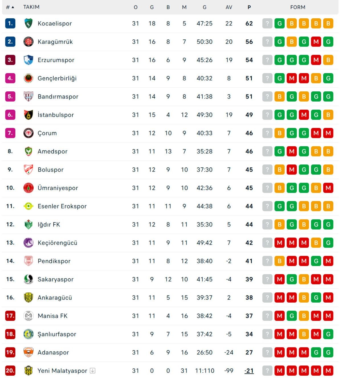 Kocaelispor'u 6 puan geriden 56 puanla takip eden Fatih Karagümrük ve 54 puana sahip Erzurumspor FK de ilk 2'de yer almak için mücadelesini sürdürüyor.