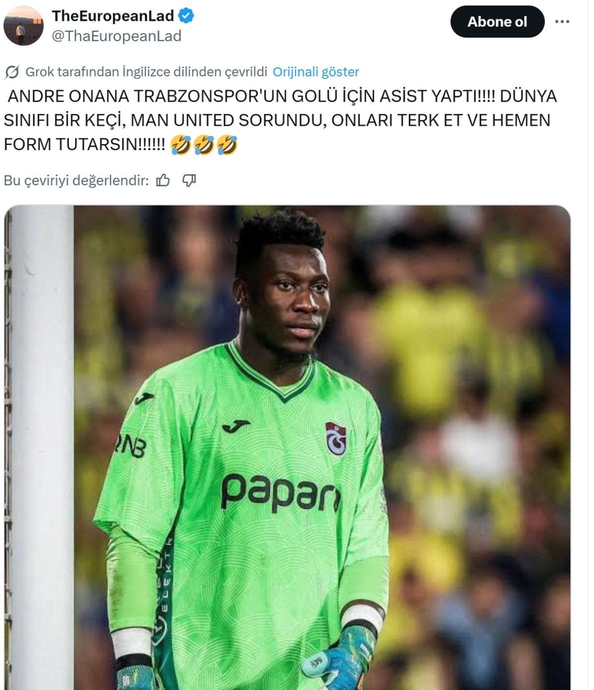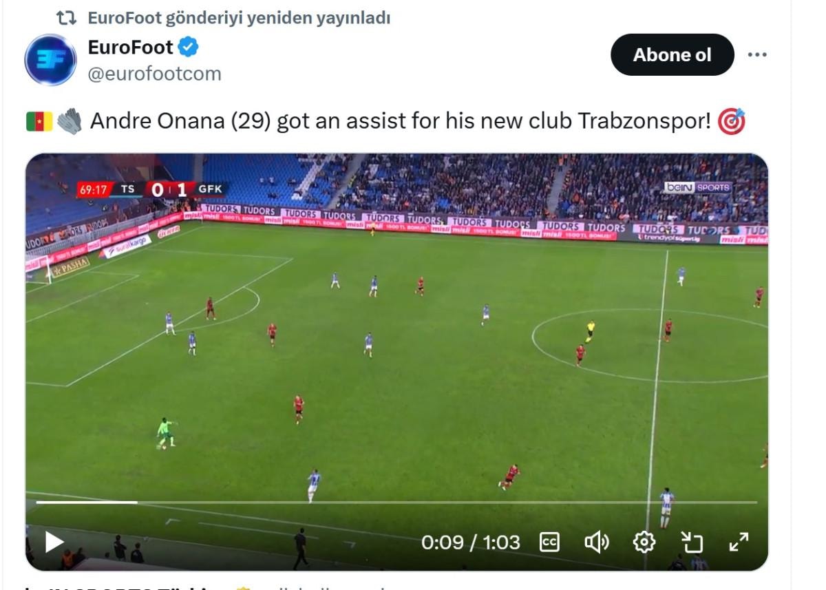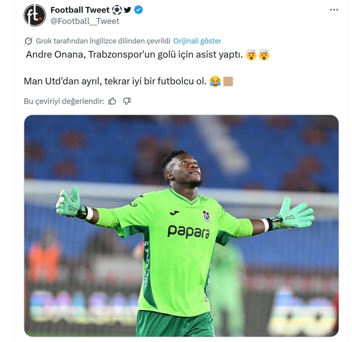 Football Tweet: “Türkiye’de Andre Onana, Trabzonspor için asist yaptı.”