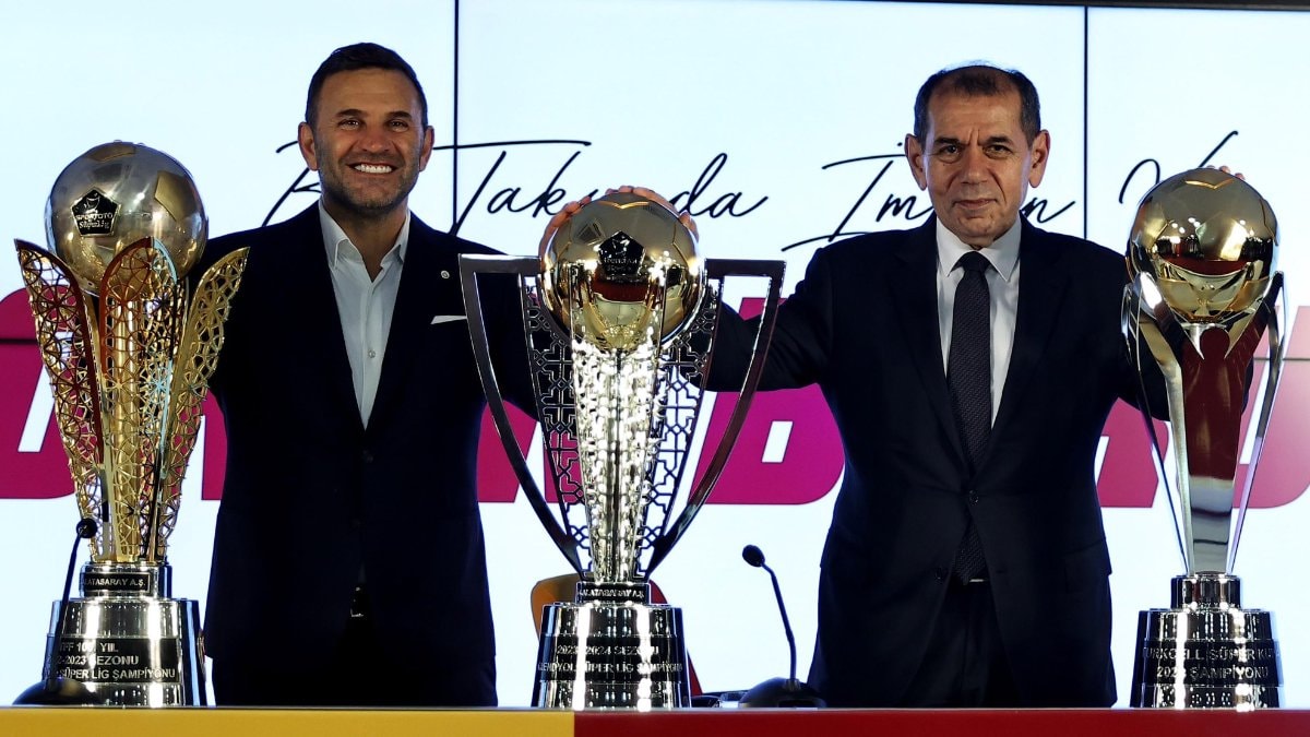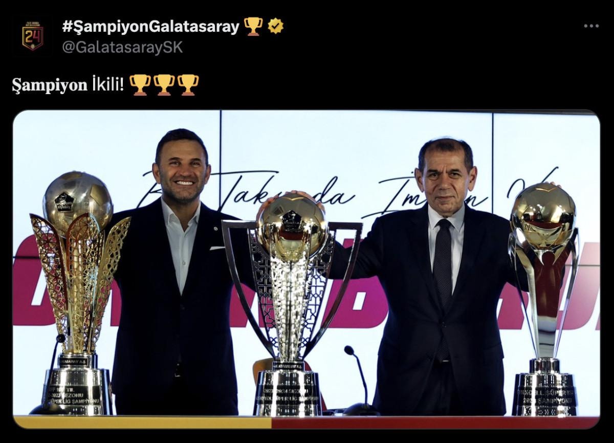 Galatasaray'ın sosyal medya hesabından yapılan açıklamada "Şampiyon İkili" sözlerine yer verilerek Dursun Özbek ve Okan Buruk'un 3 kupayla çekilmiş fotoğrafı kullanıldı.