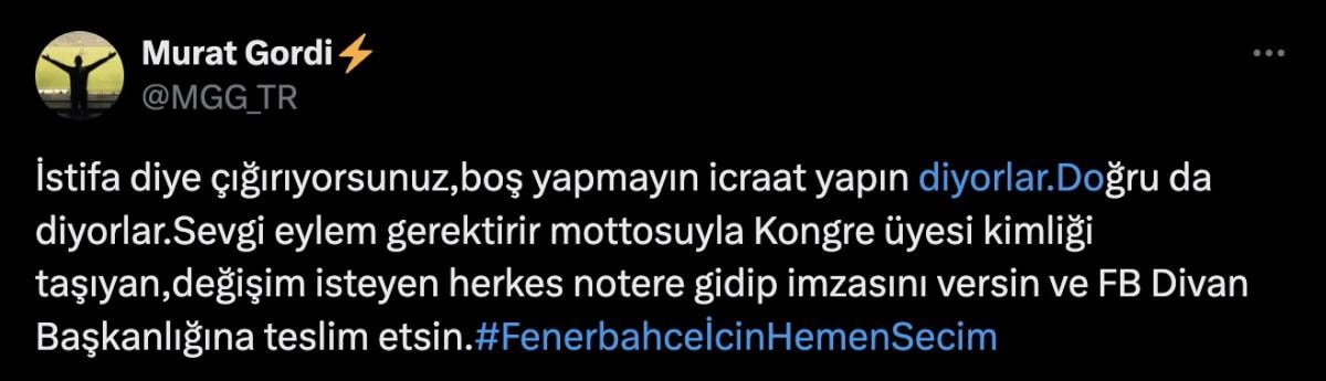 "İstifa diye çığırıyorsunuz, 'boş yapmayın icraat yapın diyorlar.' Doğru da diyorlar. 'Sevgi eylem gerektirir' mottosuyla Kongre üyelik kimliği taşıyan, değişim isteyen herkes notere gidip imzasını versin ve Fenerbahçe Divan Başkanlığı'na teslim etsin..."