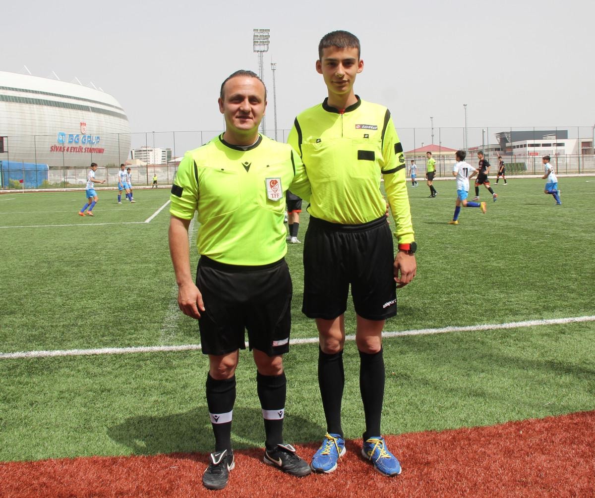 Sivas il futbol hakemlerinden Ali Selim Müşteri, 4 Eylül Spor Vadisi futbol sahasında oynanan U15 Ligi'ndeki Sivas Belediyespor-Çimentospor maçında, aday futbol hakemi oğluyla görev yaptı.