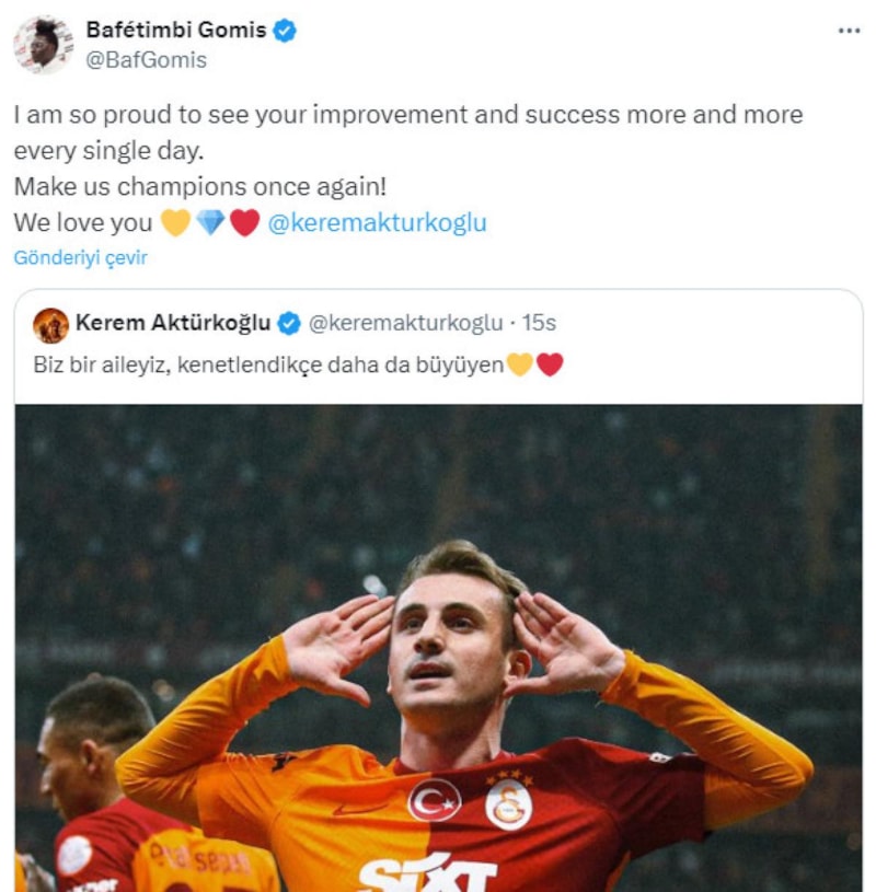 Bafetimbi Gomis, Kerem Aktürkoğlu'nun fotoğrafını paylaştığı gönderisine, "Her geçen gün gelişmeni ve başarını görmekten gurur duyuyorum. Bizi bir kez daha şampiyon yap! Seni seviyoruz." ifadelerini kullandı.