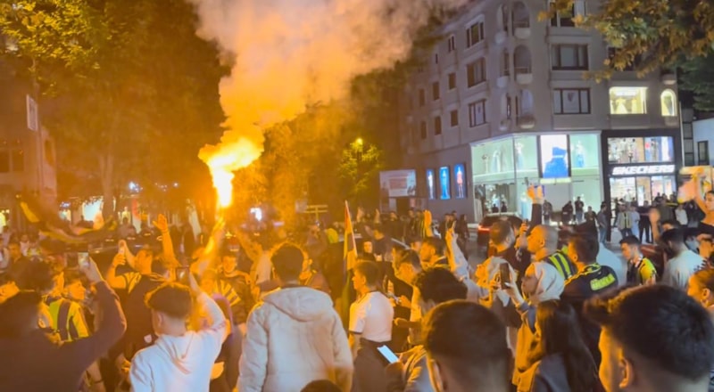 İstanbul Kadıköy'de şampiyonluk kutlaması yapan Galatasaray taraftarlarının araçlarına, Fenerbahçe taraftarları şişe ve taşlarla saldırdı.