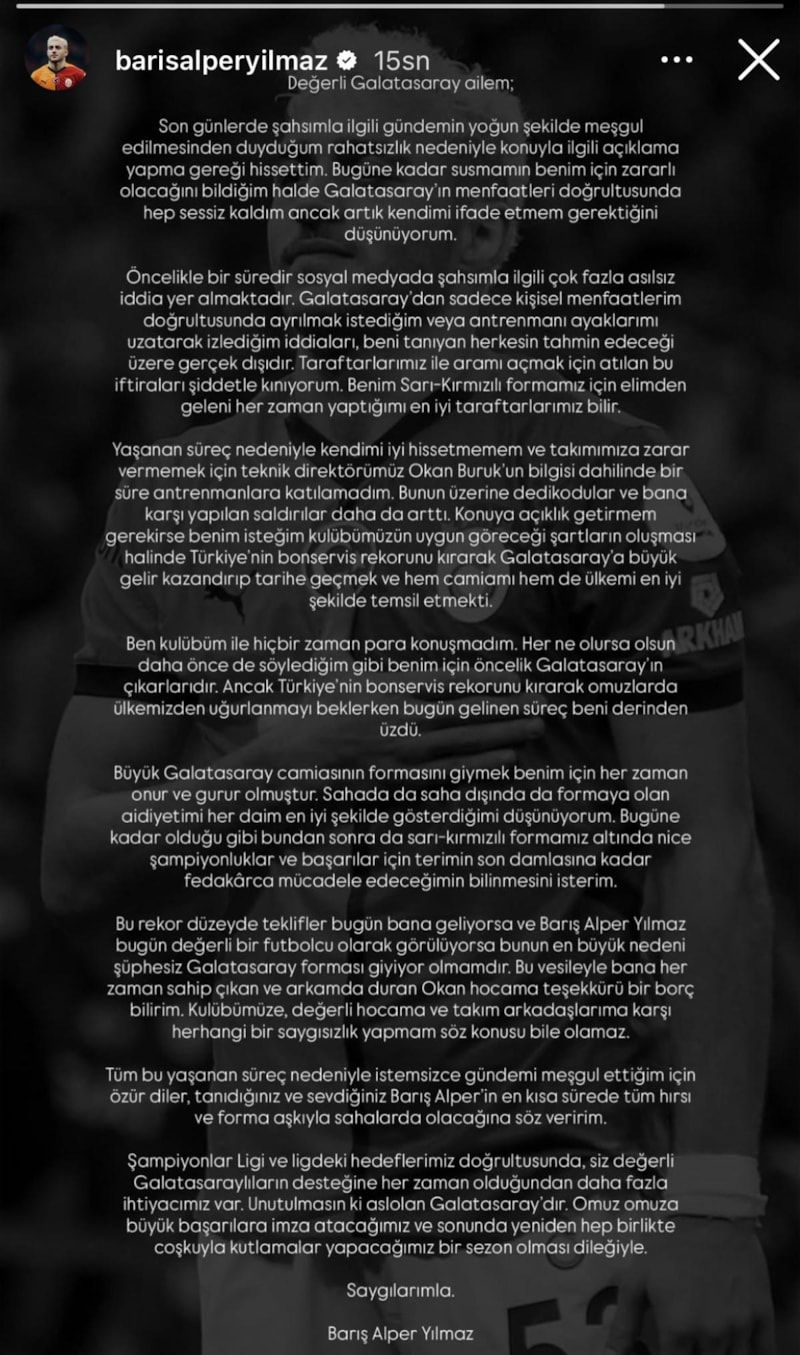 Galatasaray'ın milli futbolcusu Barış Alper Yılmaz, son günlerde hakkında çıkan transfer iddialarıyla ilgili sosyal medya hesabından bir açıklama yaptı.