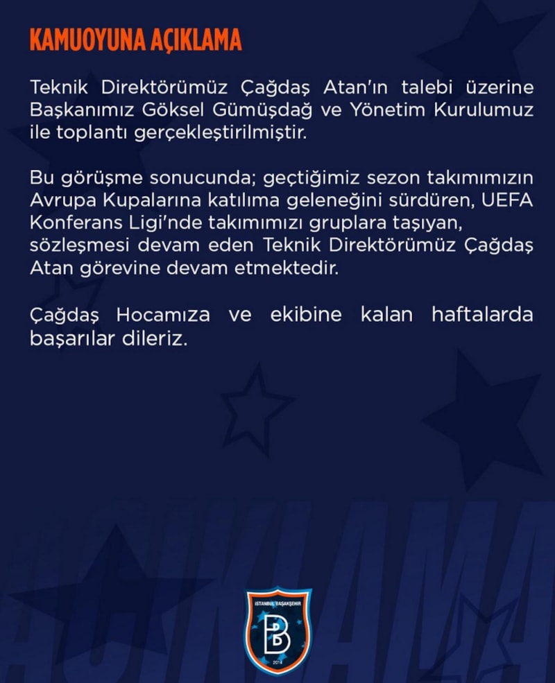 Başakşehir, Trabzonspor mağlubiyetinin ardından Teknik Direktör Çağdaş Atan'ın talebi üzerine kendisiyle toplantı yapıldığını ve görüşme sonucunda da Atan'ın görevine devam edeceğini açıkladı.