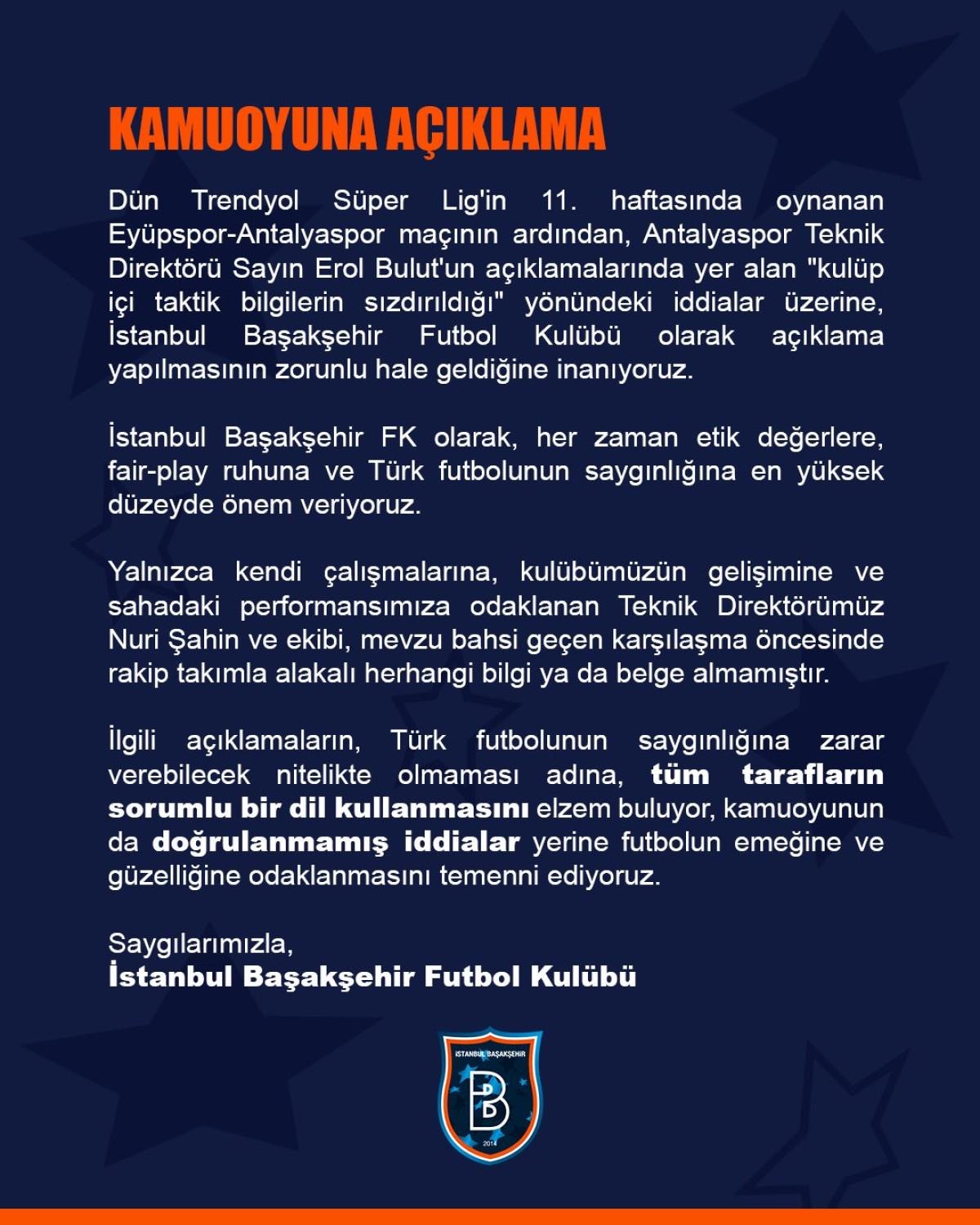 Dün Süper Lig'in 11. haftasında oynanan Eyüpspor-Antalyaspor maçının ardından, Antalyaspor Teknik Direktörü Sayın Erol Bulut'un açıklamalarında yer alan "kulüp içi taktik bilgilerin sızdırıldığı" yönündeki iddialar üzerine, İstanbul Başakşehir Futbol Kulübü olarak açıklama yapılmasının zorunlu hale geldiğine inanıyoruz. İstanbul Başakşehir FK olarak, her zaman etik değerlere, fair-play ruhuna ve Türk futbolunun saygınlığına en yüksek düzeyde önem veriyoruz. Yalnızca kendi çalışmalarına, kulübümüzün gelişimine ve sahadaki performansımıza odaklanan Teknik Direktörümüz Nuri Şahin ve ekibi, mevzu bahsi geçen karşılaşma öncesinde rakip takımla alakalı herhangi bilgi ya da belge almamıştır. İlgili açıklamaların, Türk futbolunun saygınlığına zarar verebilecek nitelikte olmaması adına, tüm tarafların sorumlu bir dil kullanmasını elzem buluyor, kamuoyunun da doğrulanmamış iddialar yerine futbolun emeğine ve güzelliğine odaklanmasını temenni ediyoruz.