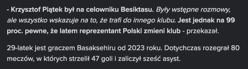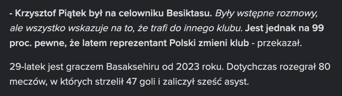 Mateusz Swiecicki ile yaptığı röportajda konuşan Piatek, "İki büyük ligden somut teklifler aldım. Transfer döneminin bitimine 5 saat kala çok güçlü bir takımdan cazip bir teklif geldi. Karar vermek için zamanımız olsaydı belki ayrılık gerçekleşebilirdi." ifadelerini kullandı.