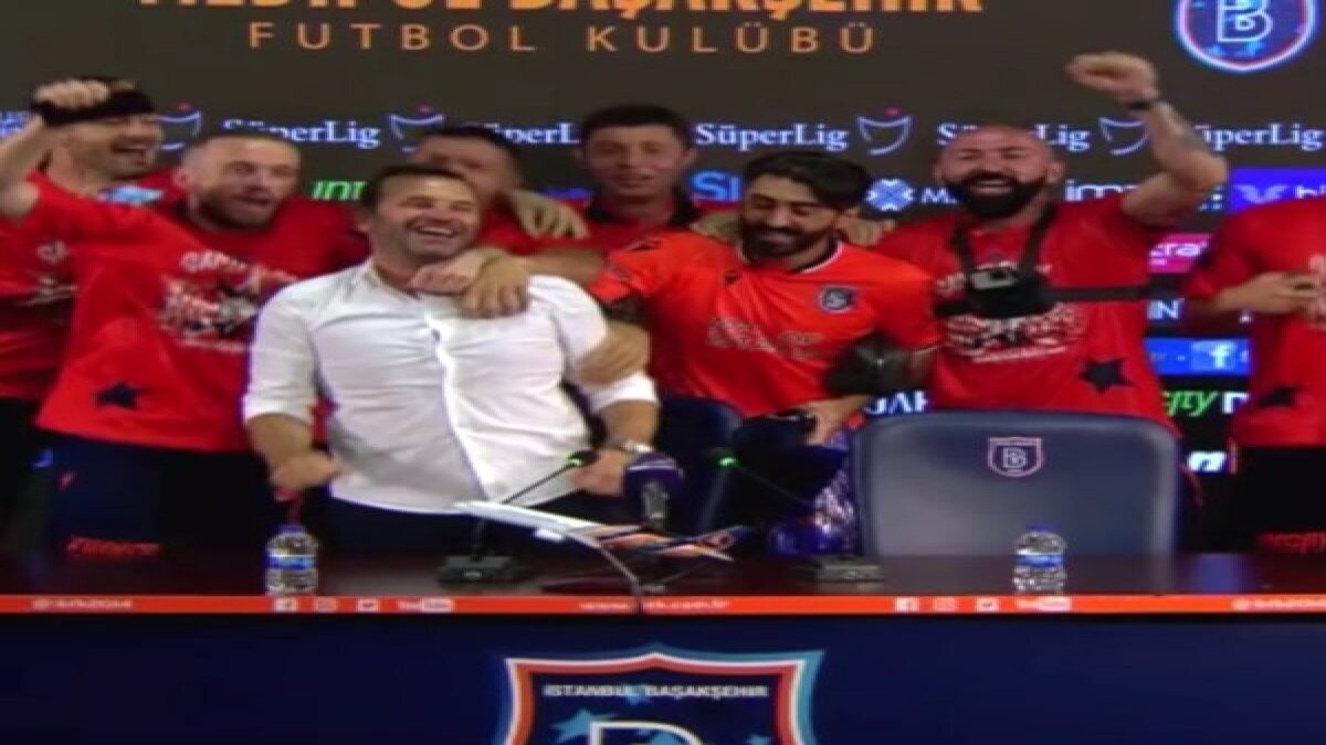 Başakşehirli futbolcular Okan Buruk'un basın toplantısında salona gelerek, coşkulu bir kutlamayla şampiyonluk sevinci yaşadı.