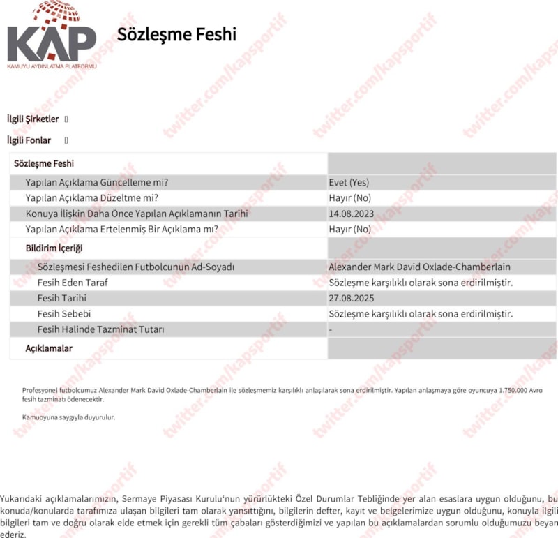 Profesyonel futbolcumuz Alexander Mark David Oxlade-Chamberlain ile sözleşmemiz karşılıklı anlaşılarak sona erdirilmiştir. Yapılan anlaşmaya göre oyuncuya 1.750.000 Avro fesih tazminatı ödenecektir.