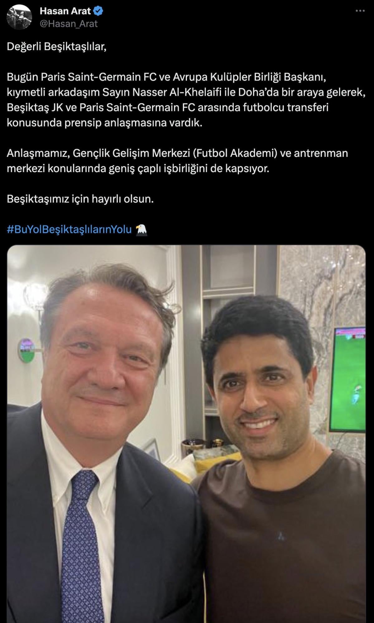 Bugün Paris Saint-Germain FC ve Avrupa Kulüpler Birliği Başkanı, kıymetli arkadaşım Sayın Nasser Al-Khelaifi ile Doha’da bir araya gelerek, Beşiktaş JK ve Paris Saint-Germain FC arasında futbolcu transferi konusunda prensip anlaşmasına vardık. Anlaşmamız, Gençlik Gelişim Merkezi (Futbol Akademi) ve antrenman merkezi konularında geniş çaplı işbirliğini de kapsıyor.