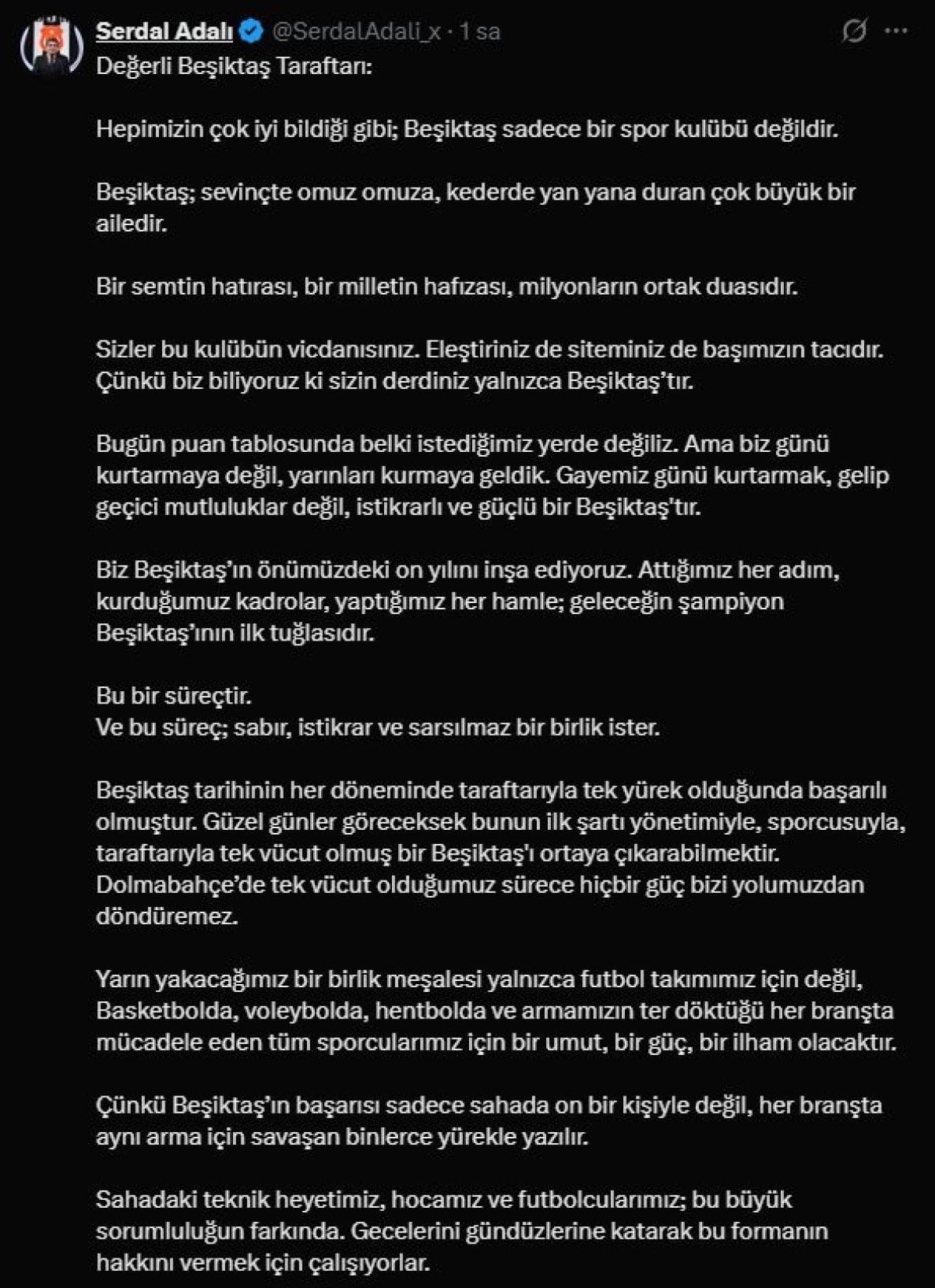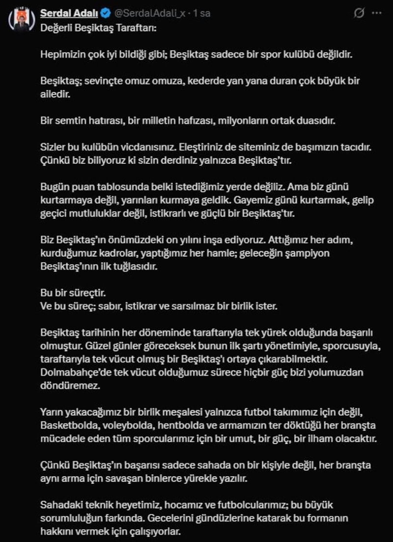 Tribünlerden yükselen protestoların ardından Beşiktaş Başkanı Serdal Adalı, sosyal medya hesabından taraftarlara hitaben bir açıklama yayımladı.