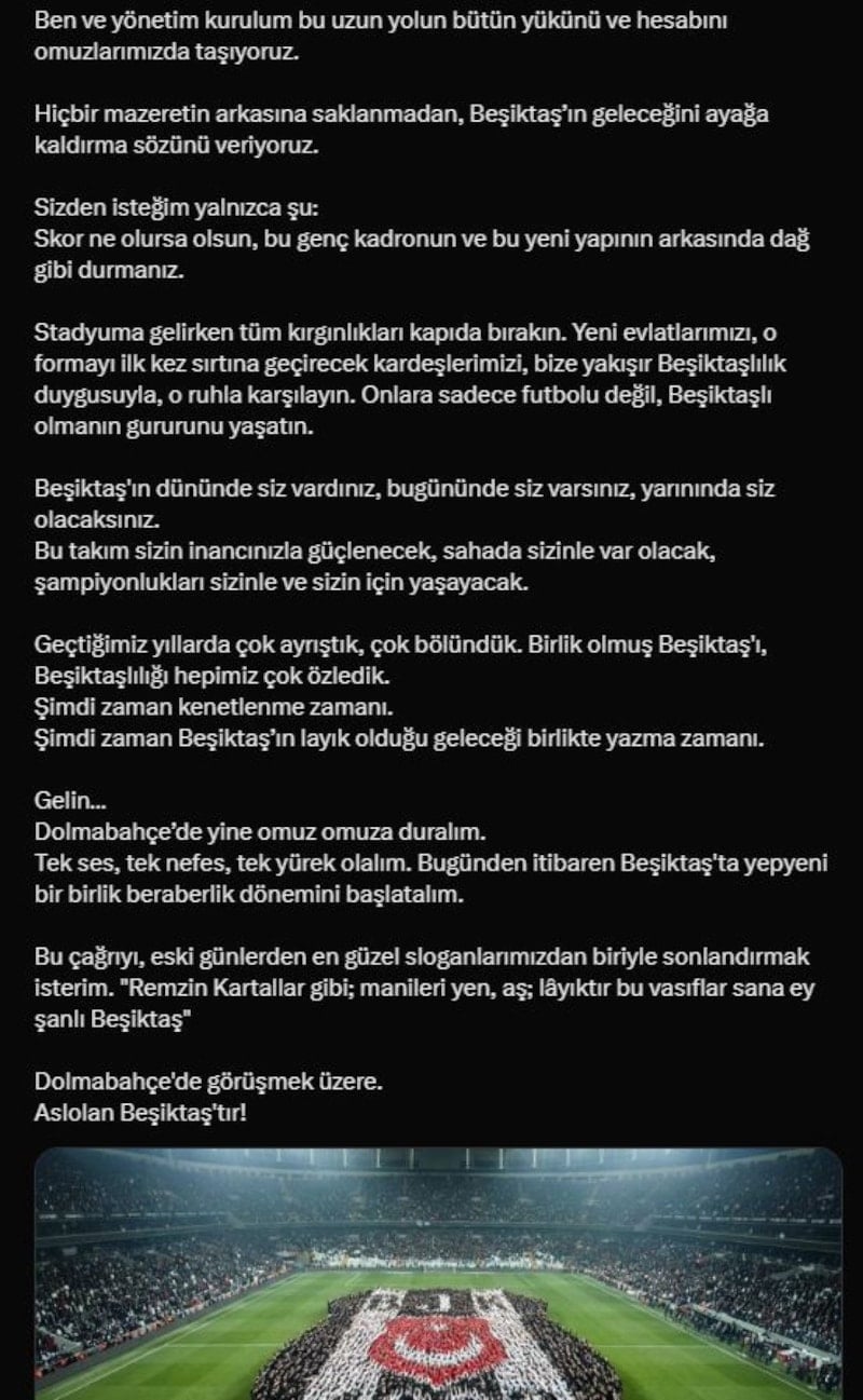 Adalı, paylaşımında Beşiktaş’ın yalnızca bir spor kulübü olmadığını vurgulayarak taraftarlardan takıma destek olmalarını istedi.