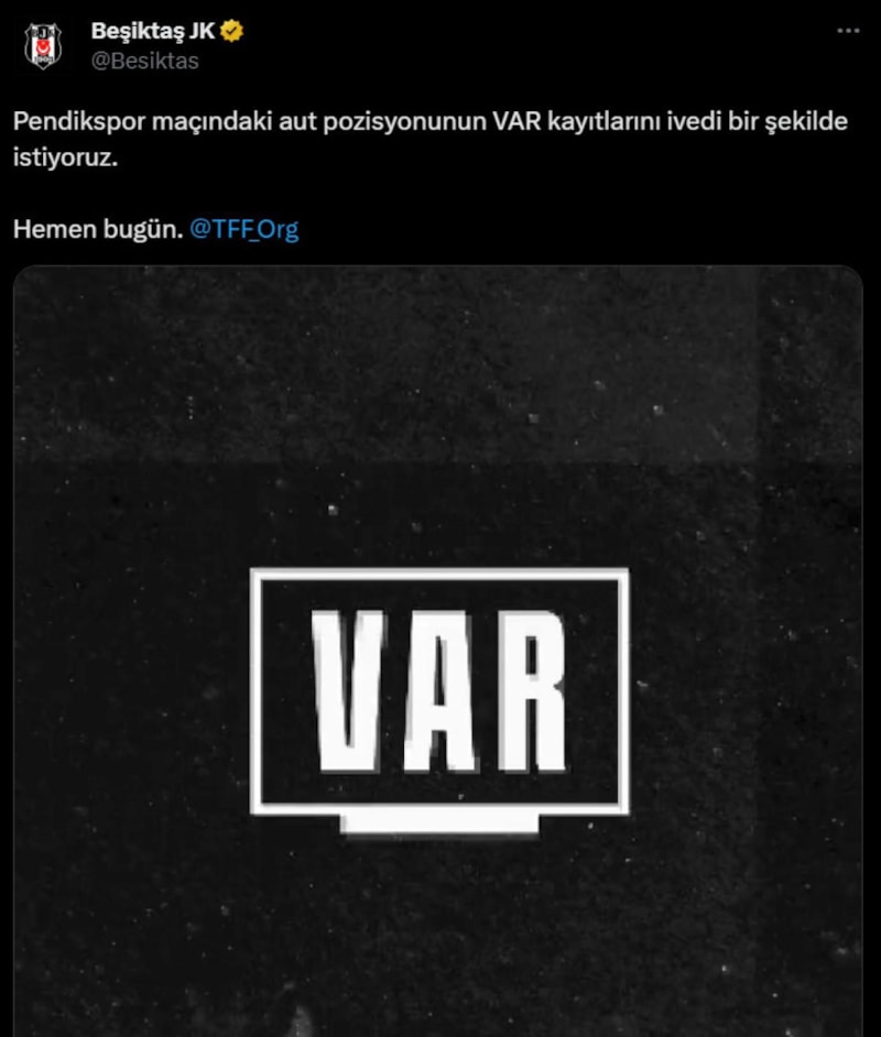 TFF'ye çağrıda bulunan Beşiktaş kulübü, "Pendikspor maçındaki aut pozisyonunun VAR kayıtlarını ivedi bir şekilde istiyoruz. Hemen bugün." ifadelerini kullandı.