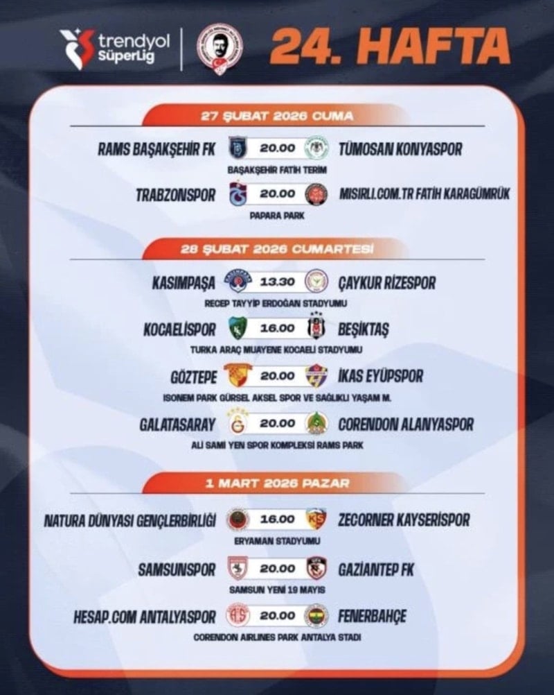 Buna göre Türkiye Futbol Federasyonu, Süper Lig'in 24-25. hafta maçlarının programını açıkladı.
