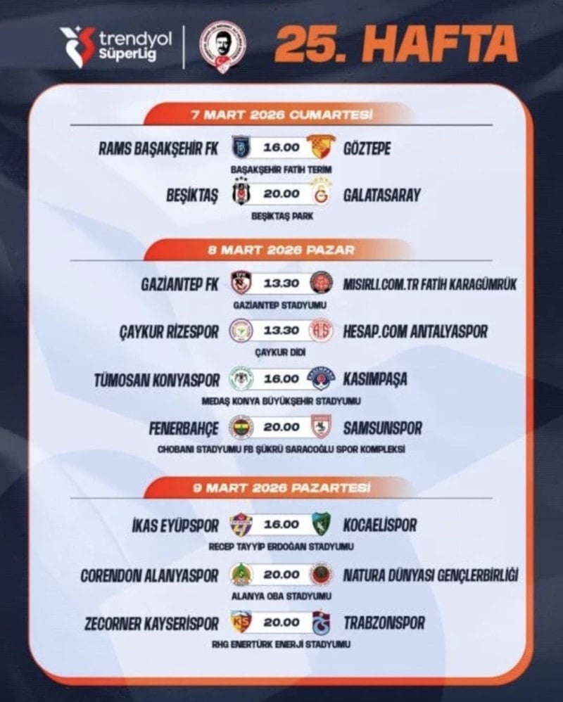 TFF, Süper Lig'in 25. haftasındaki Beşiktaş-Galatasaray derbisinin 7 Mart 2026 Cumartesi günü oynanacağını açıkladı.
