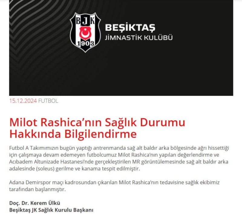 Siyah-beyazlılardan yapılan açıklamada, Milot Rashica'nın sağ alt baldır arka adalesinde gerilme ve kanama tespit edildiği ve 28 yaşındaki Kosovalı futbolcunun Adana Demirspor maçının kadrosundan çıkartıldığı belirtildi.