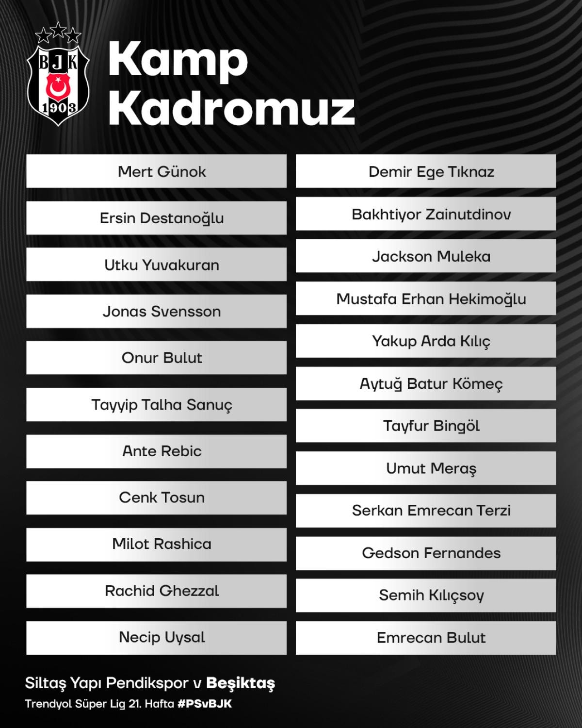 Süper Lig'in 21. haftasında cumartesi günü Pendikspor'a konuk olacak Beşiktaş'ta 23 kişilik kamp kadrosu açıklandı.