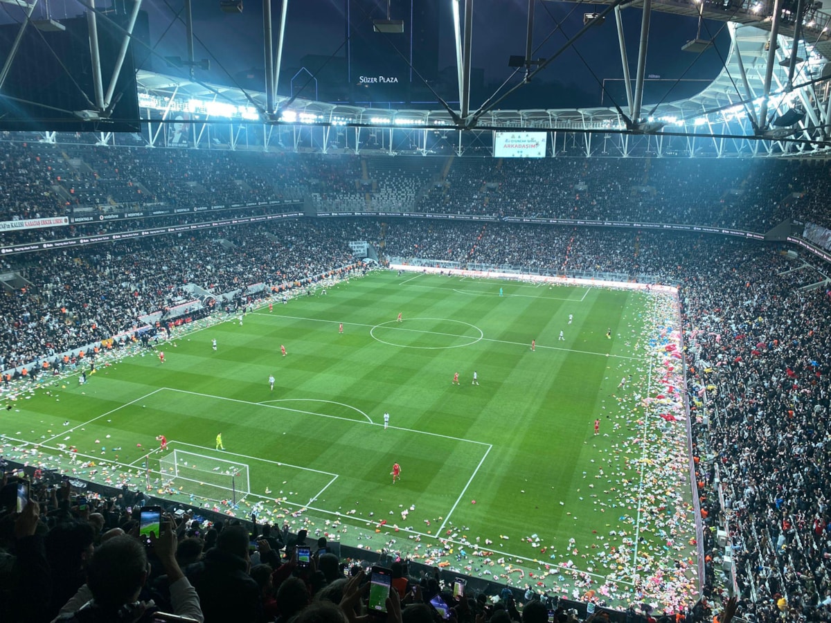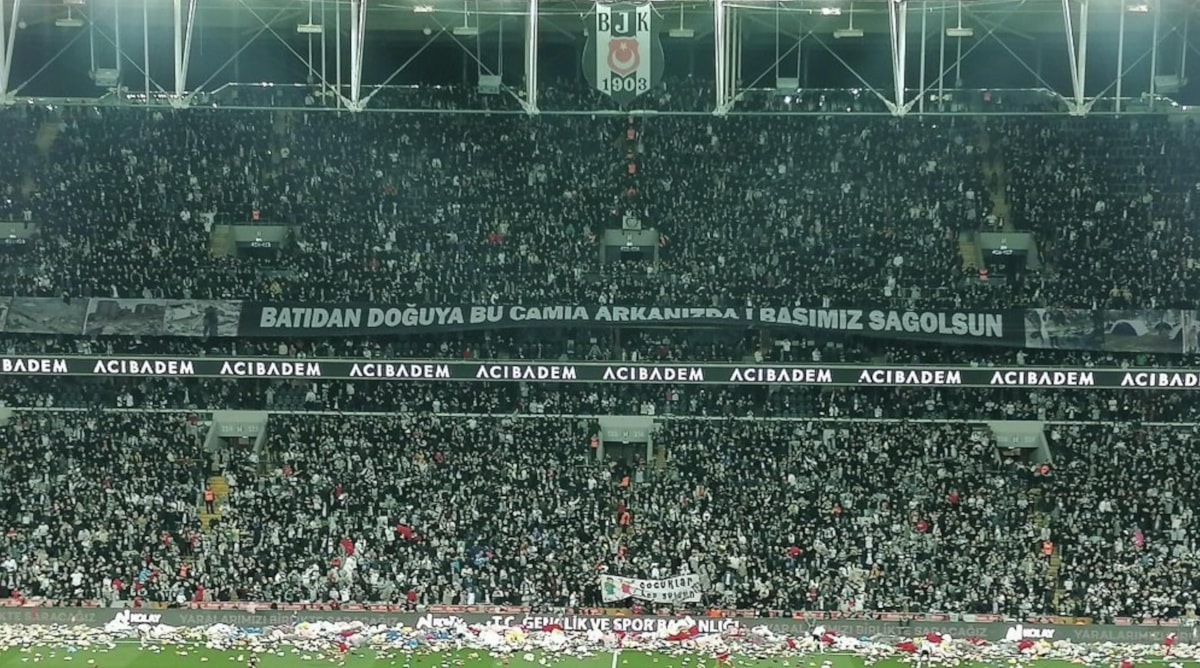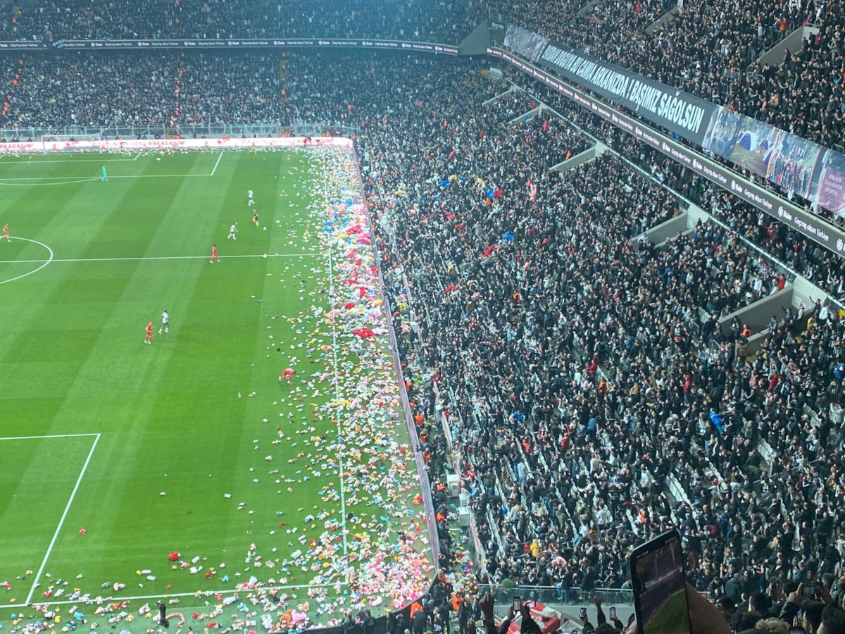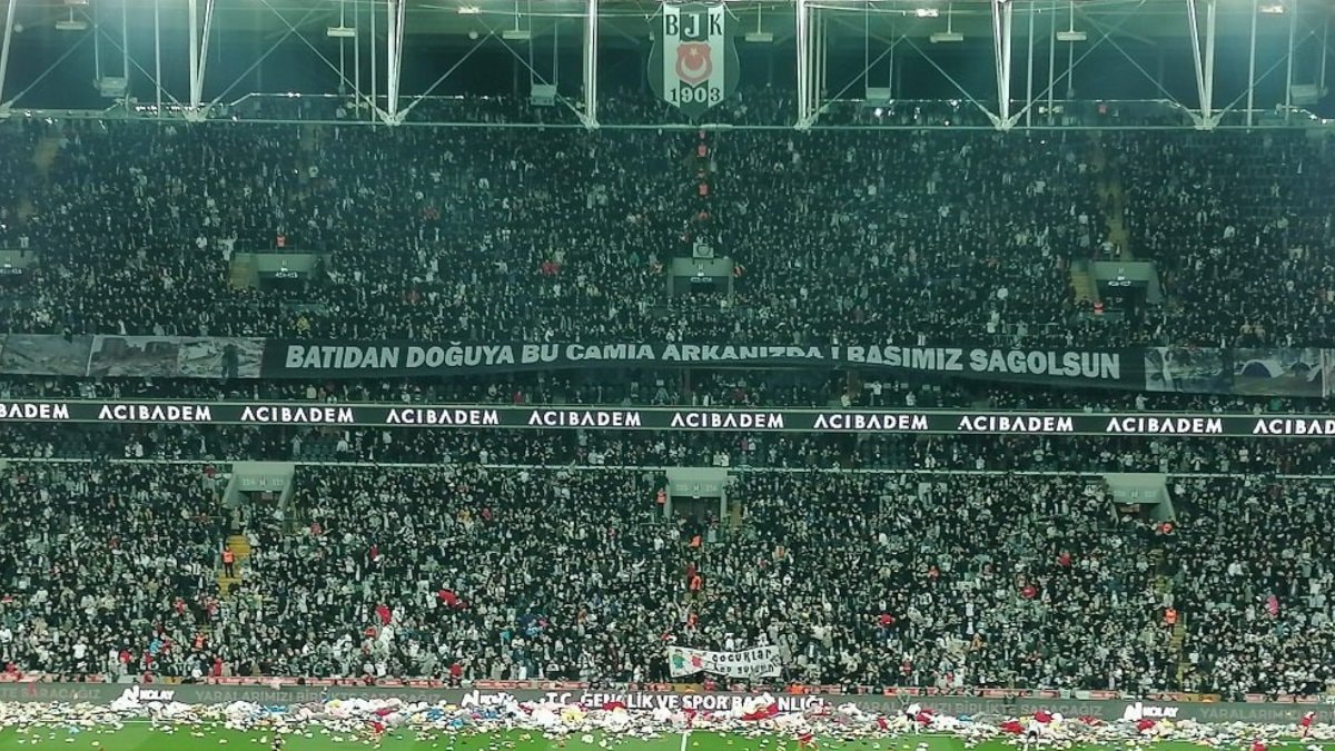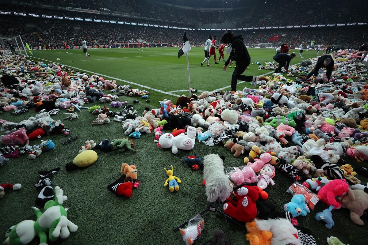 Beşiktaş - Antalyaspor maçının 4. dakika 17. saniyesinde siyah-beyazlı taraftarlar depremzedeler adına sahaya oyuncak atıldı.