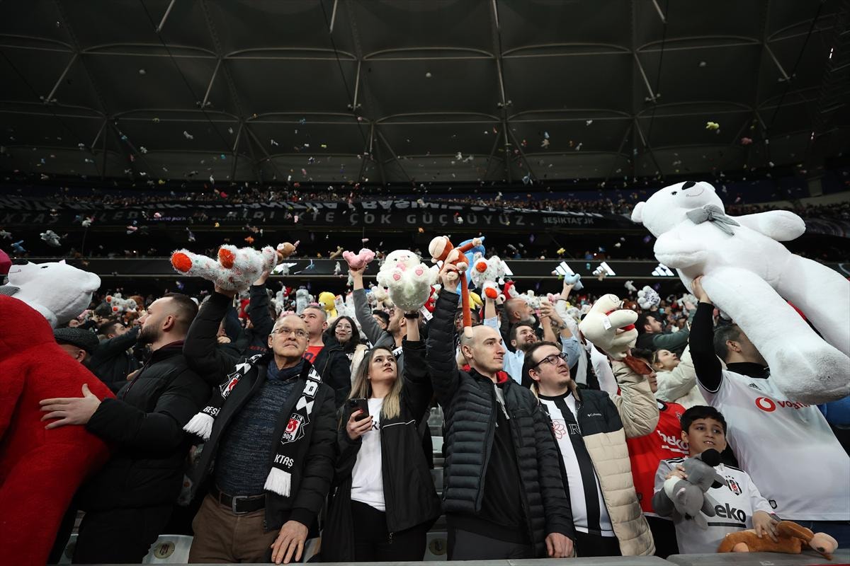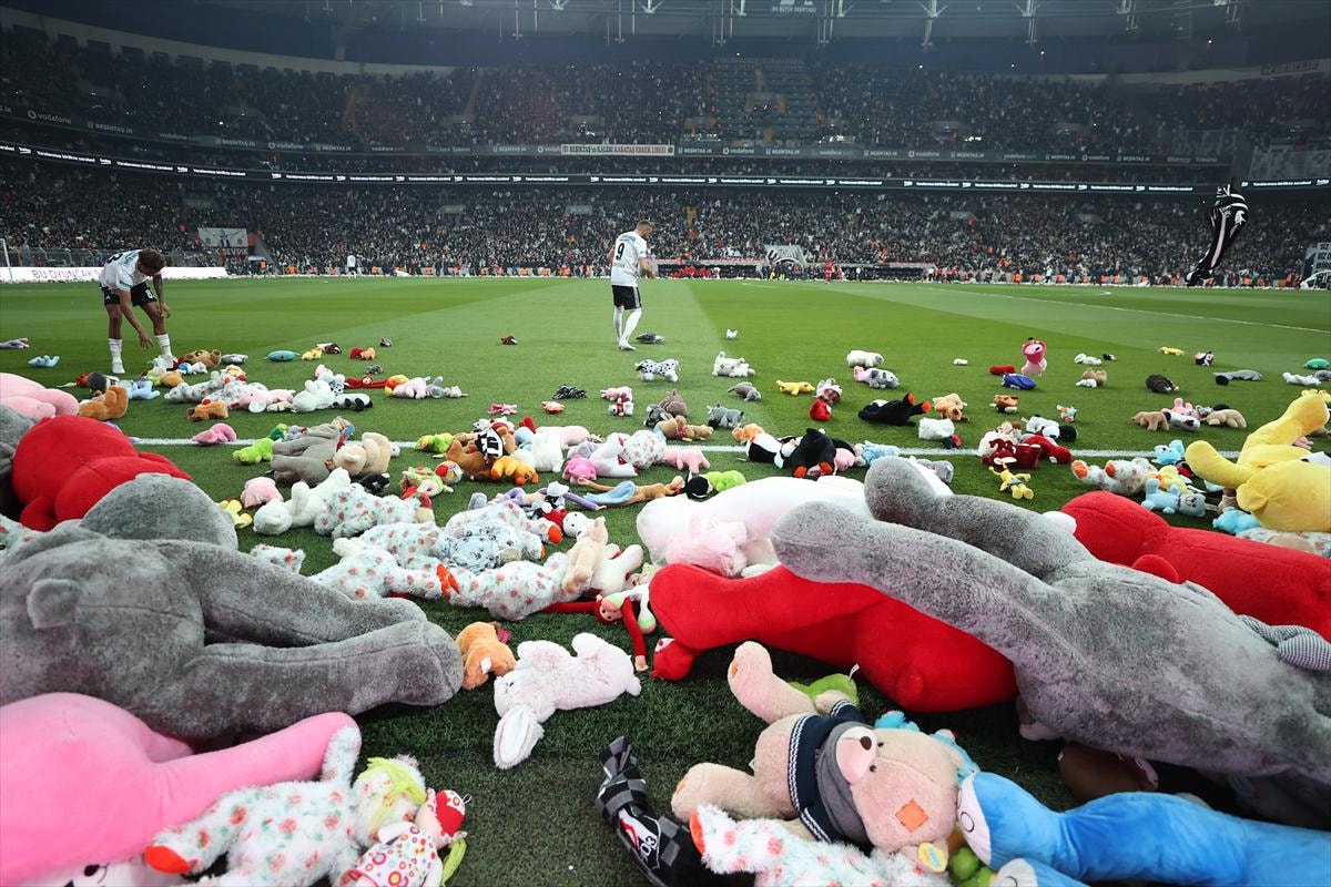 Beşiktaş taraftarı, depremzedeler adına sahaya oyuncak attı