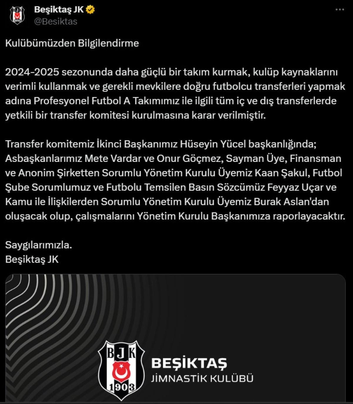 2024-2025 sezonunda daha güçlü bir takım kurmak, kulüp kaynaklarını verimli kullanmak ve gerekli mevkilere doğru futbolcu transferleri yapmak adına Profesyonel Futbol A Takımımız ile ilgili tüm iç ve dış transferlerde yetkili bir transfer komitesi kurulmasına karar verilmiştir.