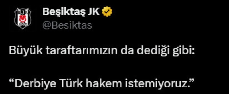 Öte yandan Beşiktaş Kulübü, Gaziantep FK'ya 2-1'lik skorla kaybedilen maçın ardından Büyük taraftarımızın da dediği gibi: "Derbiye Türk hakem istemiyoruz." ifadelerini kullandı.