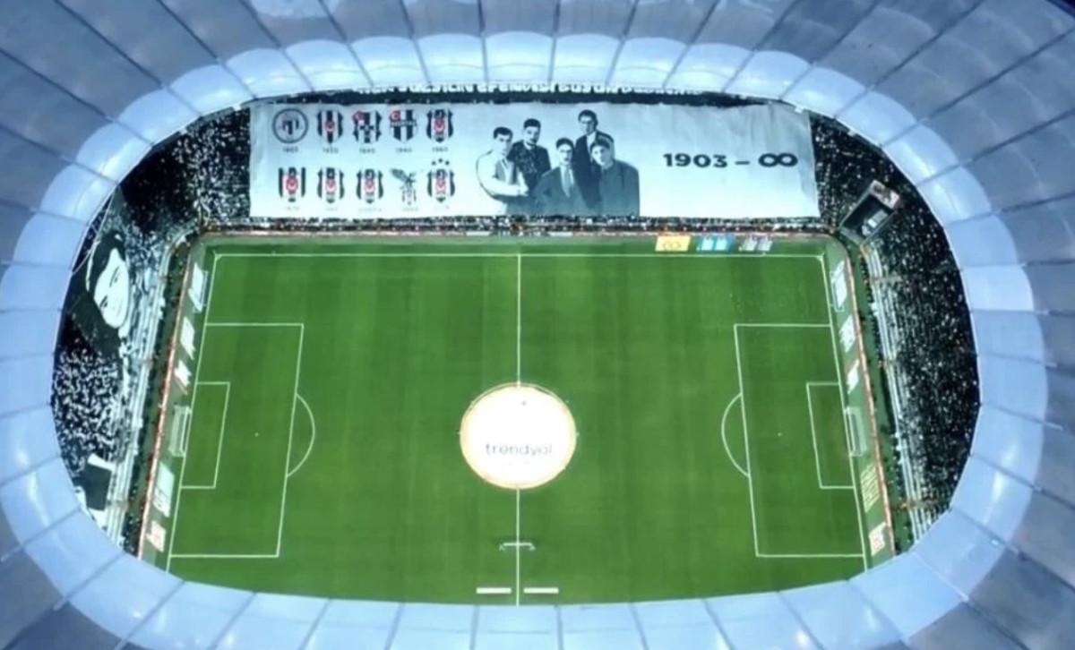 Bir tribünde Beşiktaş'ın kurucularının fotoğrafları ve kulüp tarihinde kullanılan logolar yer aldı.