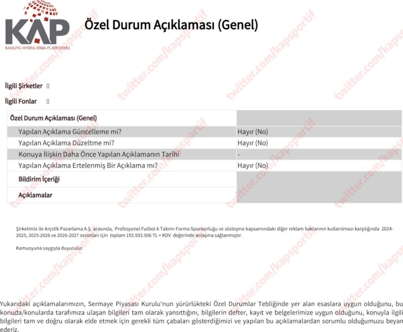 Şirketimiz ile Arçelik Pazarlama A.Ş. arasında, Profesyonel Futbol A Takımı Forma Sponsorluğu ve sözleşme kapsamındaki diğer reklam haklarının kullanılması karşılığında 2024-2025, 2025-2026 ve 2026-2027 sezonları için toplam 193.593.506 TL + KDV değerinde anlaşma sağlanmıştır.