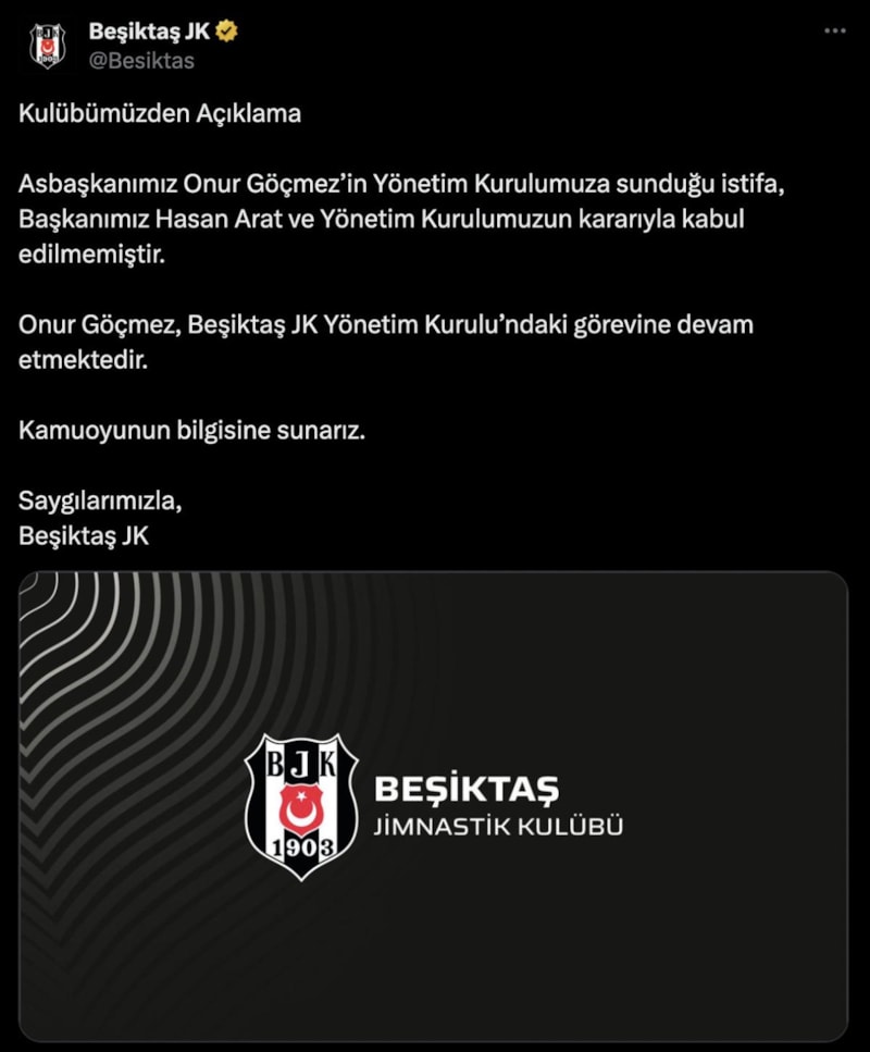 Asbaşkanımız Onur Göçmez’in Yönetim Kurulumuza sunduğu istifa, Başkanımız Hasan Arat ve Yönetim Kurulumuzun kararıyla kabul edilmemiştir.