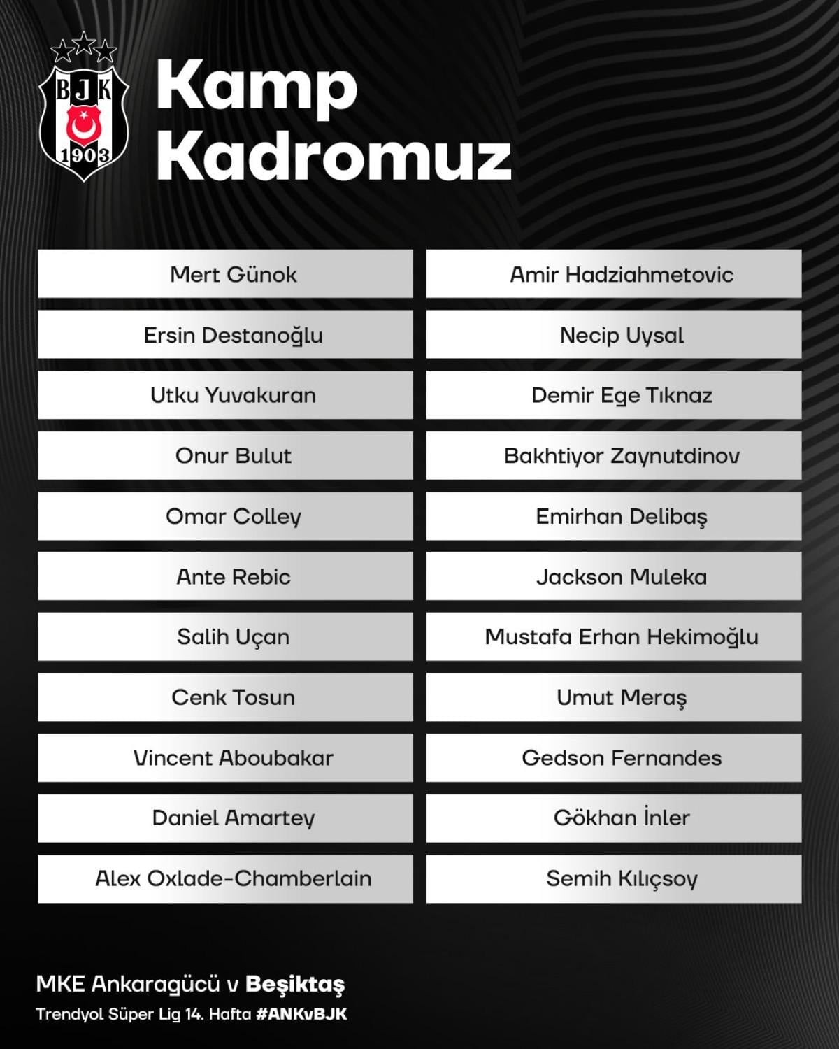 Kulüpten yapılan açıklamada, Valentin Rosier, Milot Rashica, Rachid Ghezzal, Eric Bailly, Jean Onana, Tayfur Bingöl, Arthur Masuaku, Tayyip Talha Sanuç ve Emrecan Uzunhan kadroda yer almazken, Daniel Amartey kamp kadrosunda yer aldı.