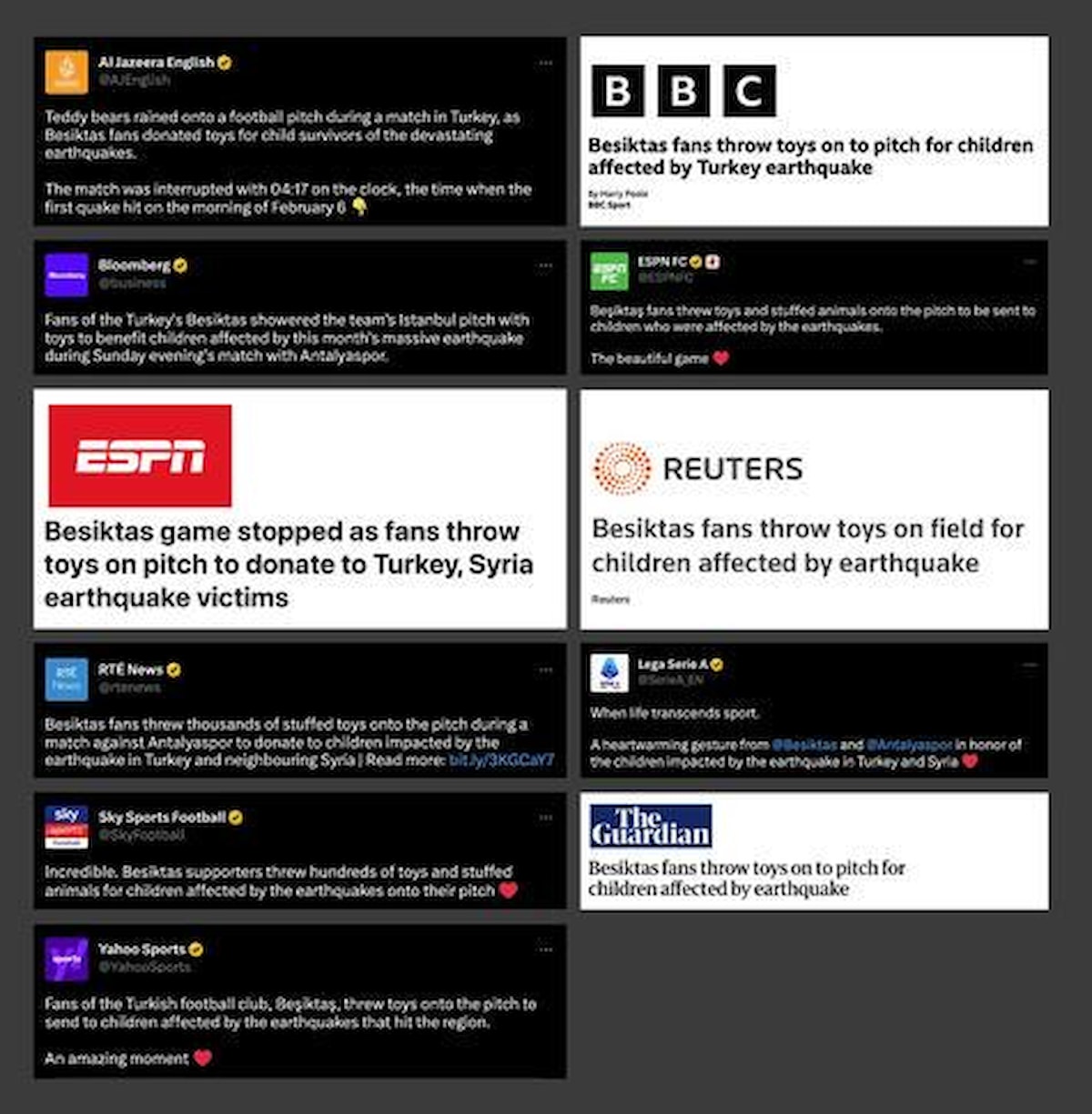 "İnanılmaz. Beşiktaş taraftarı, depremden etkilenen çocuklar için yüzlerce oyuncağı ve içi doldurulmuş oyuncakları sahaya fırlattı."